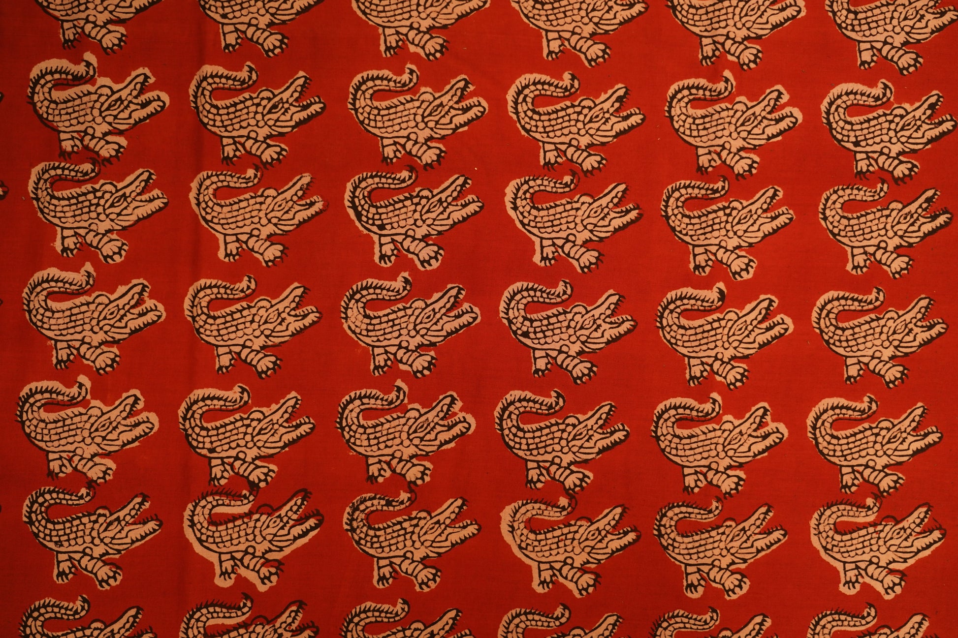 Bold brick red cotton fabric featuring a repeating block-printed crocodile motif in beige with black outlines. The quirky, tribal-style artwork adds a playful yet rustic charm—perfect for sunny day, shirts, Kurtis.