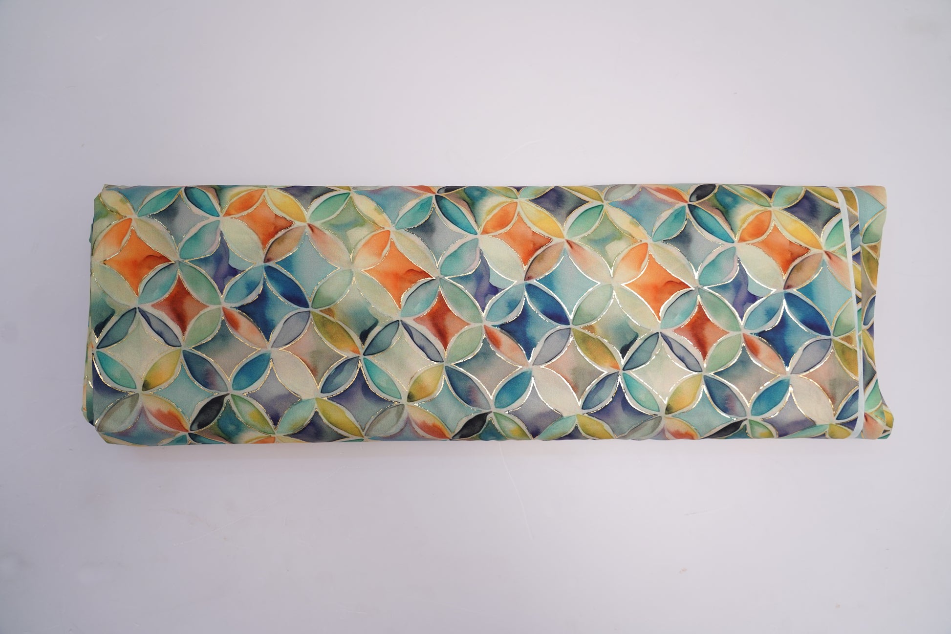 This BSY silk fabric features a watercolor geometric pattern in aqua-mint, teal, blue, orange, and olive tones. Gold foil outlines elevate each petal-shaped motif, giving the fabric a vibrant, modern, and luxurious appeal perfect for contemporary outfits.