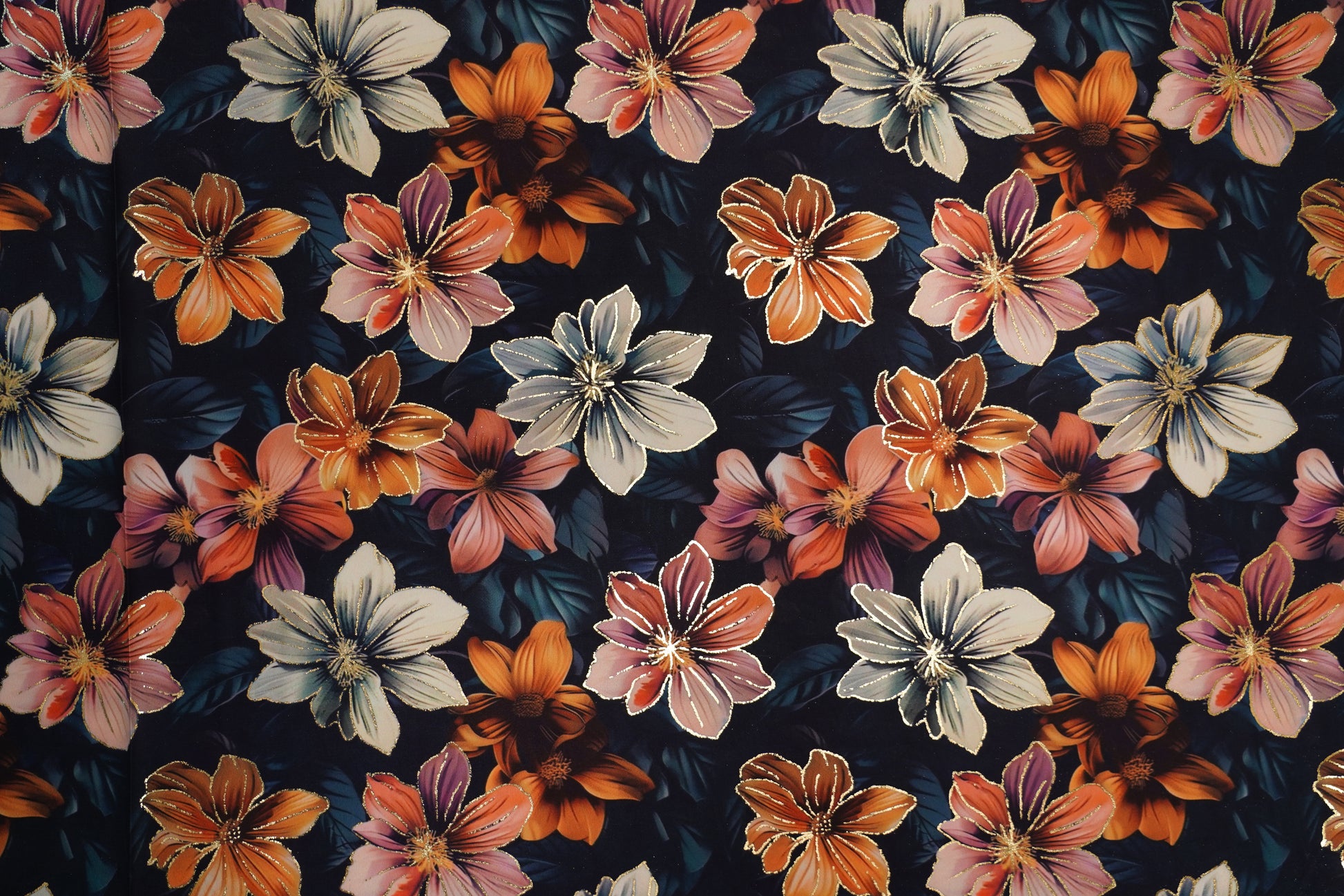 This BSY silk fabric displays mustard yellow, peach and cream florals blooming over a deep dark blue base. Teal-green leaves and gold foil detailing add richness and sparkle, giving the fabric a luxurious and festive appeal.