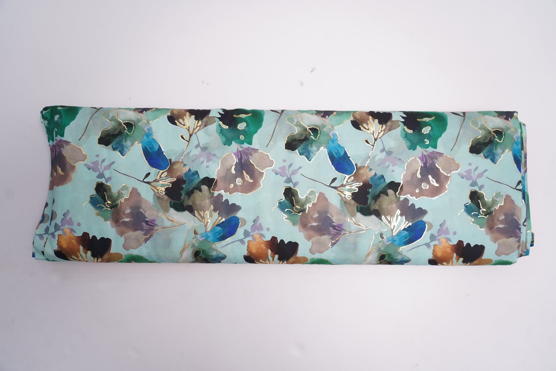 This BSY silk fabric features soft watercolor florals in green, deep blue, mauve, and taupe over a refreshing mint base. Gold foil outlines add a luminous touch, giving the fabric an elegant, artistic, and premium designer appeal.