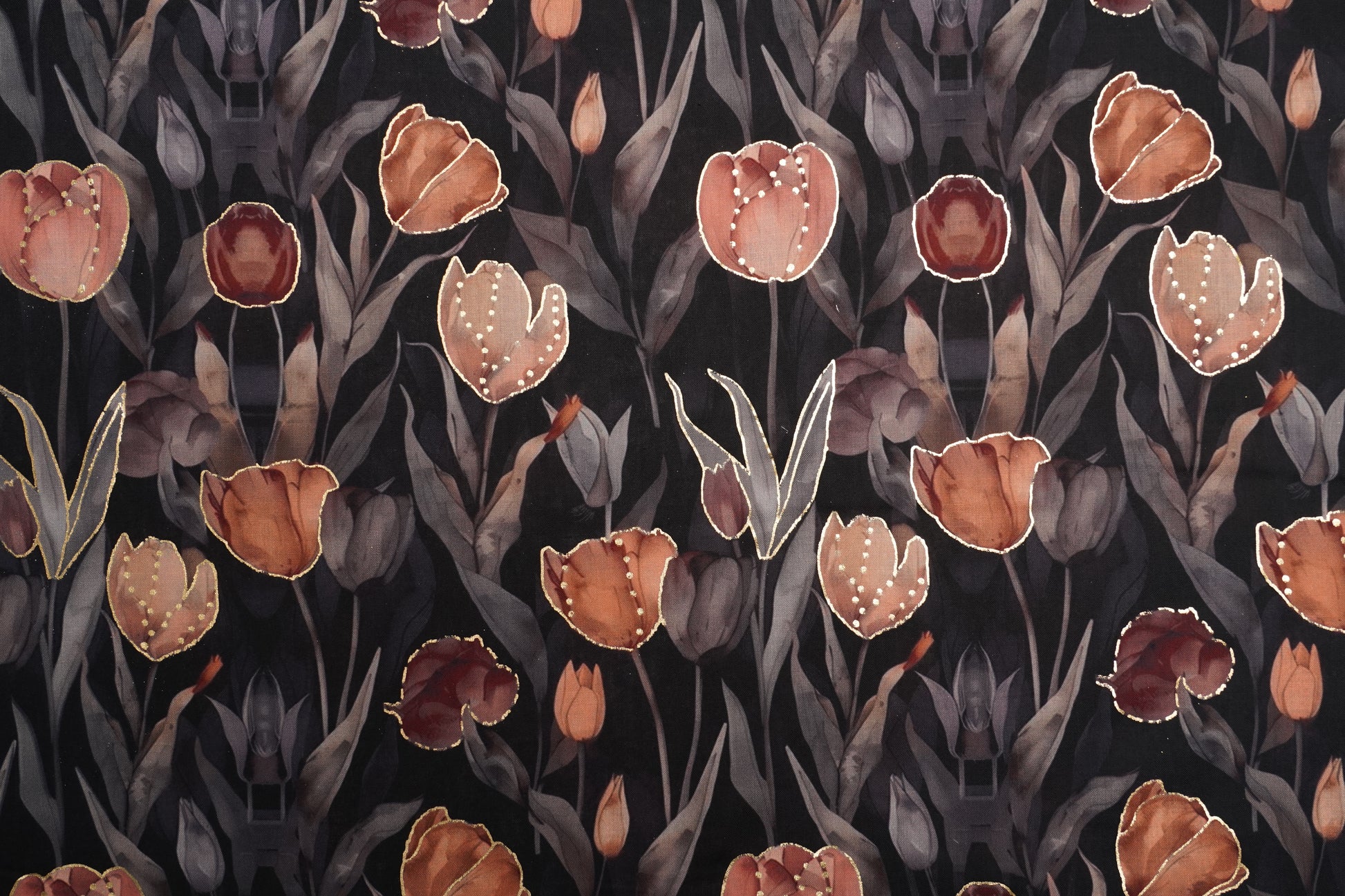 This cambric cotton fabric features a deep black base adorned with rustic brown and tan florals, enriched with muted grey leaves and delicate golden outlines. The rich contrast and artistic detailing create an elegant, earthy, and premium drape.