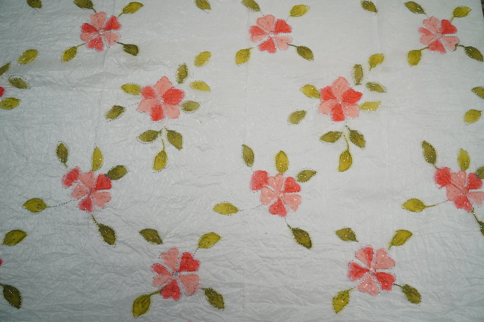 Soft ivory crush silk adorned with peach and coral-peach floral motifs. Olive-green leaves and delicate sequins add gentle shimmer. A refined, elegant fabric perfect for graceful festive, ethnic, and designer ensembles.