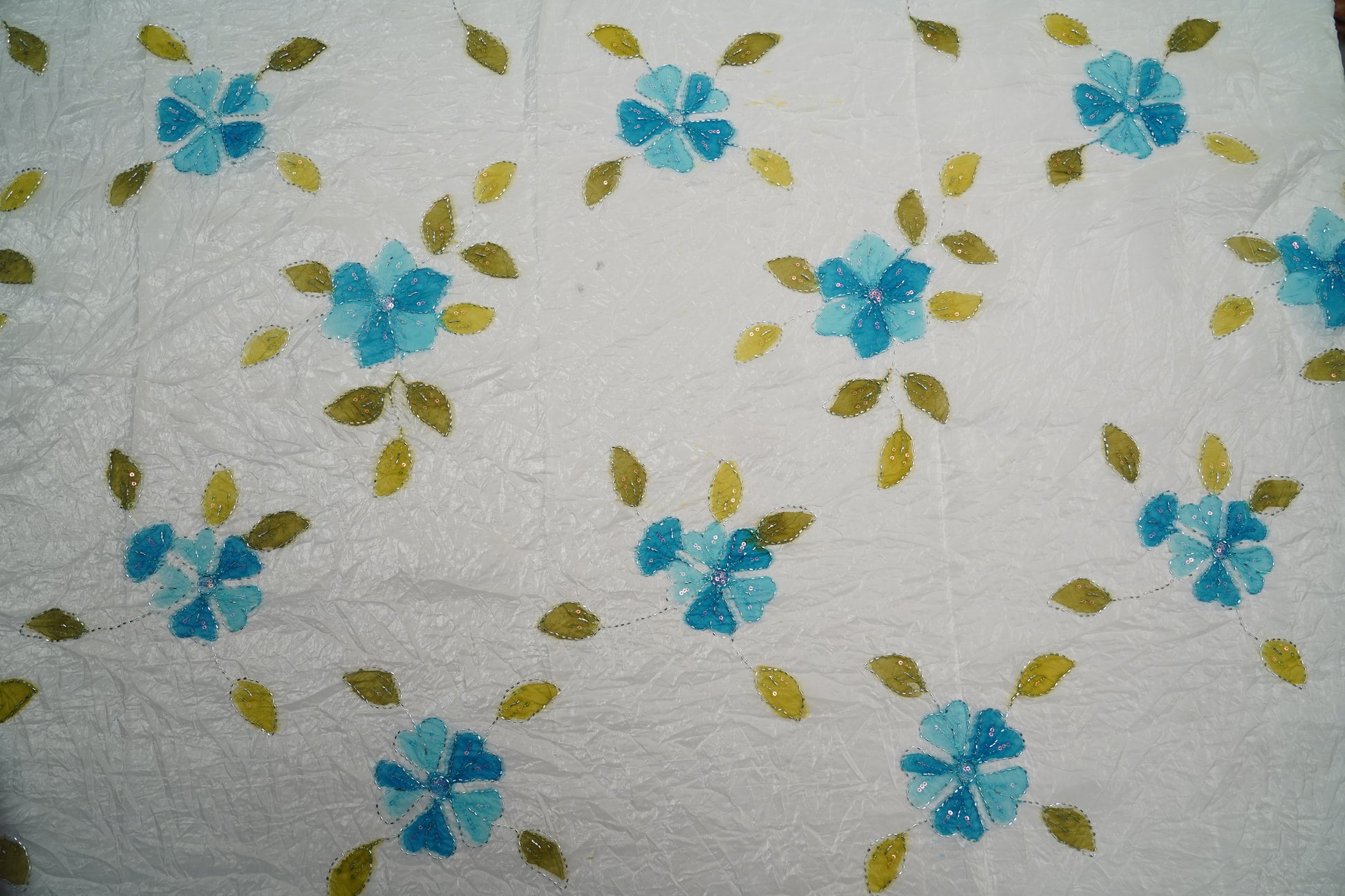 Soft ivory crush silk adorned with refreshing turquoise–aqua blue floral clusters, highlighted with subtle sequins for a delicate shimmer. Olive green leaves add warmth, creating a breezy, elegant drape perfect for festive and contemporary outfits.