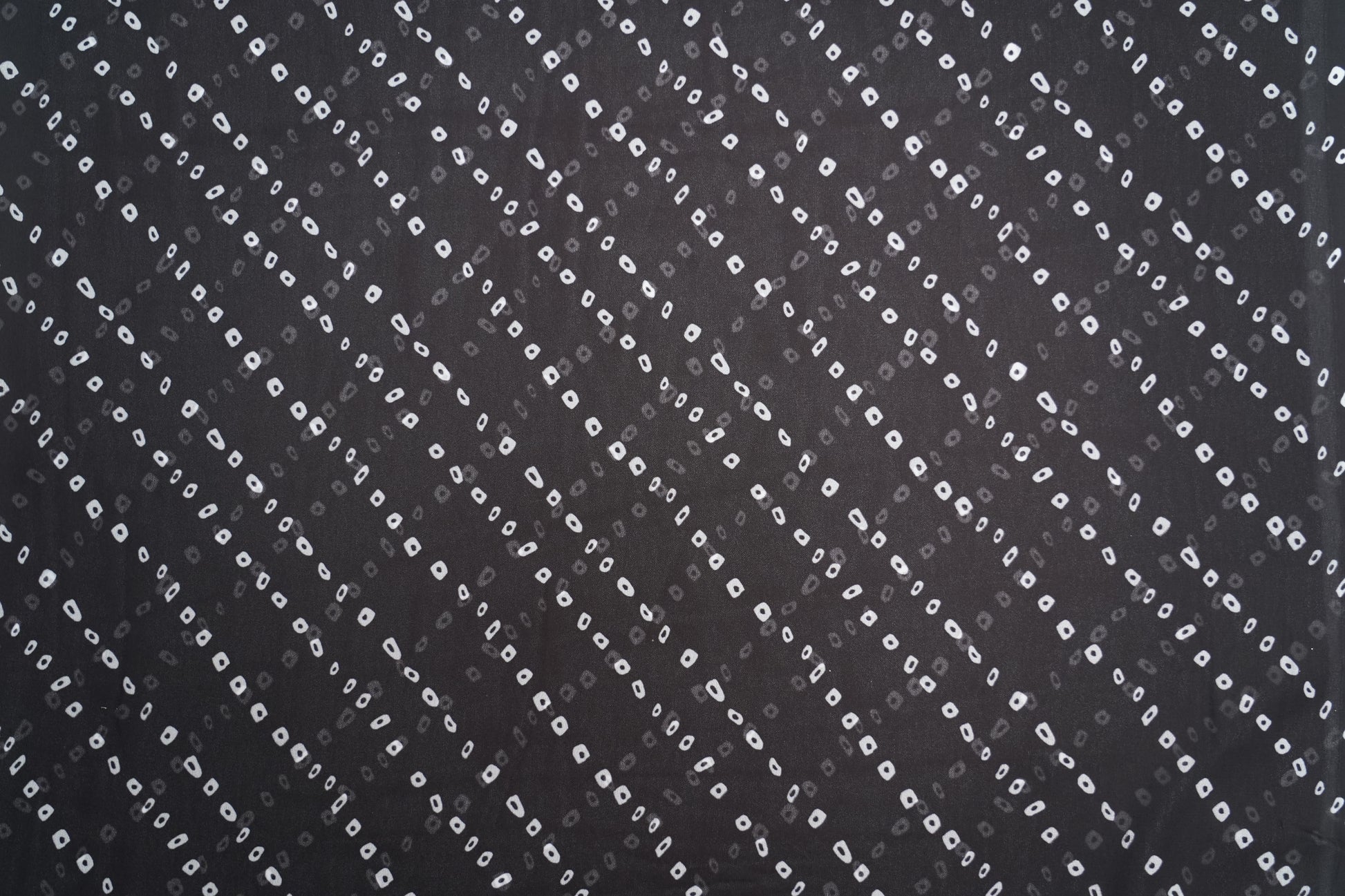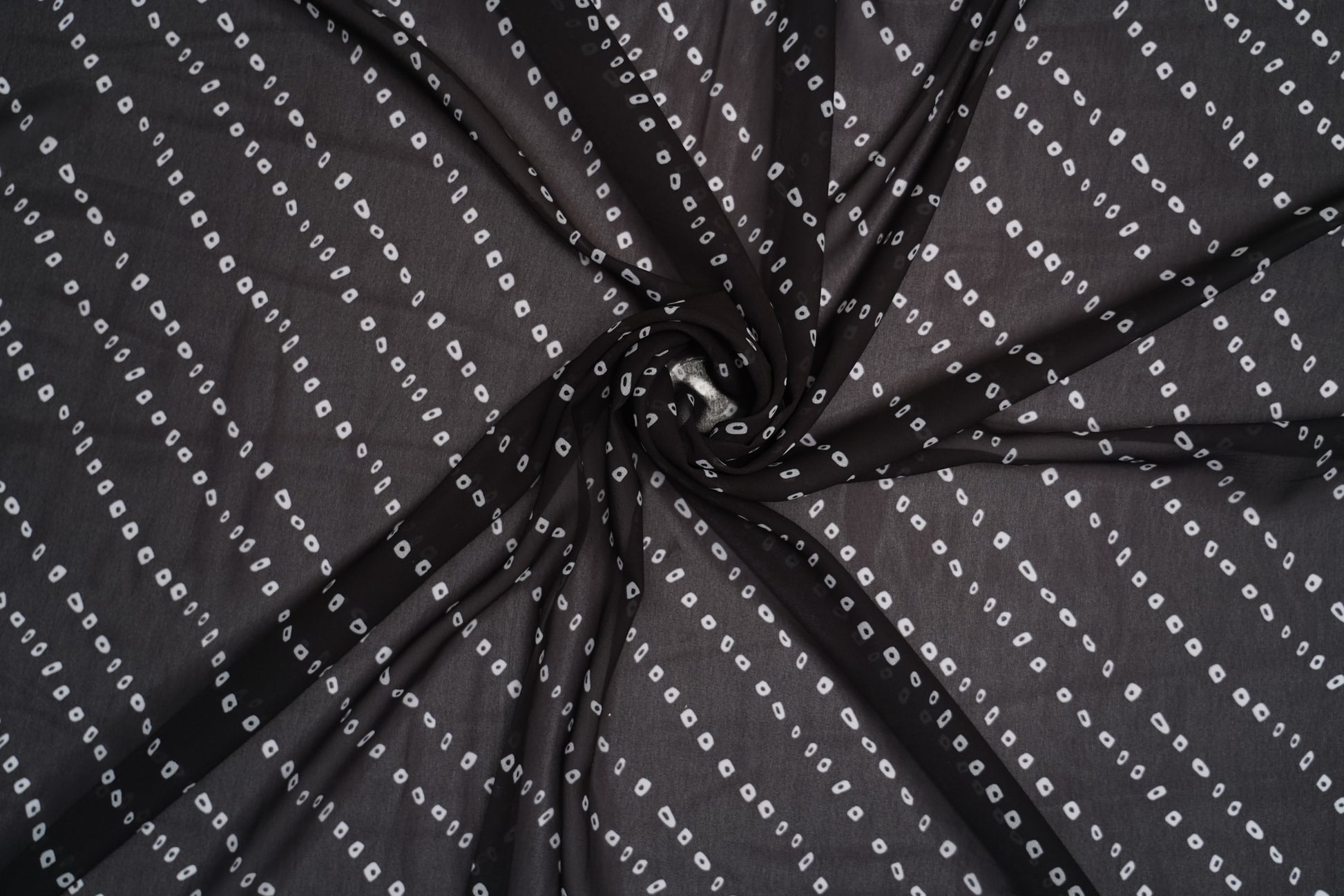 A sleek jet-black digital georgette fabric adorned with soft white diagonal dot motifs, creating a chic and contemporary pattern. Its lightweight, flowy drape and modern minimal design make it perfect for stylish Kurtis, tops, and sarees.