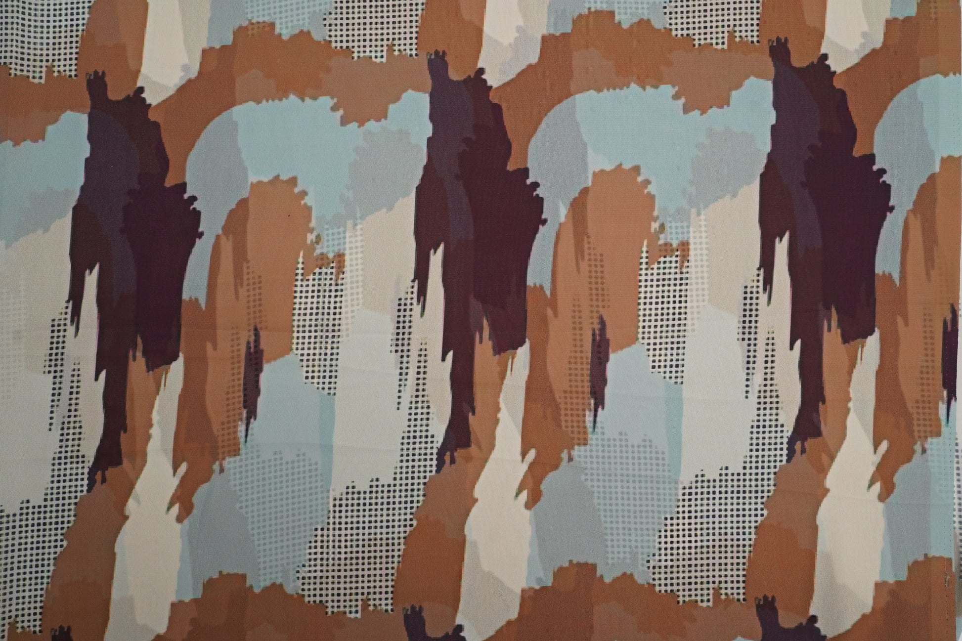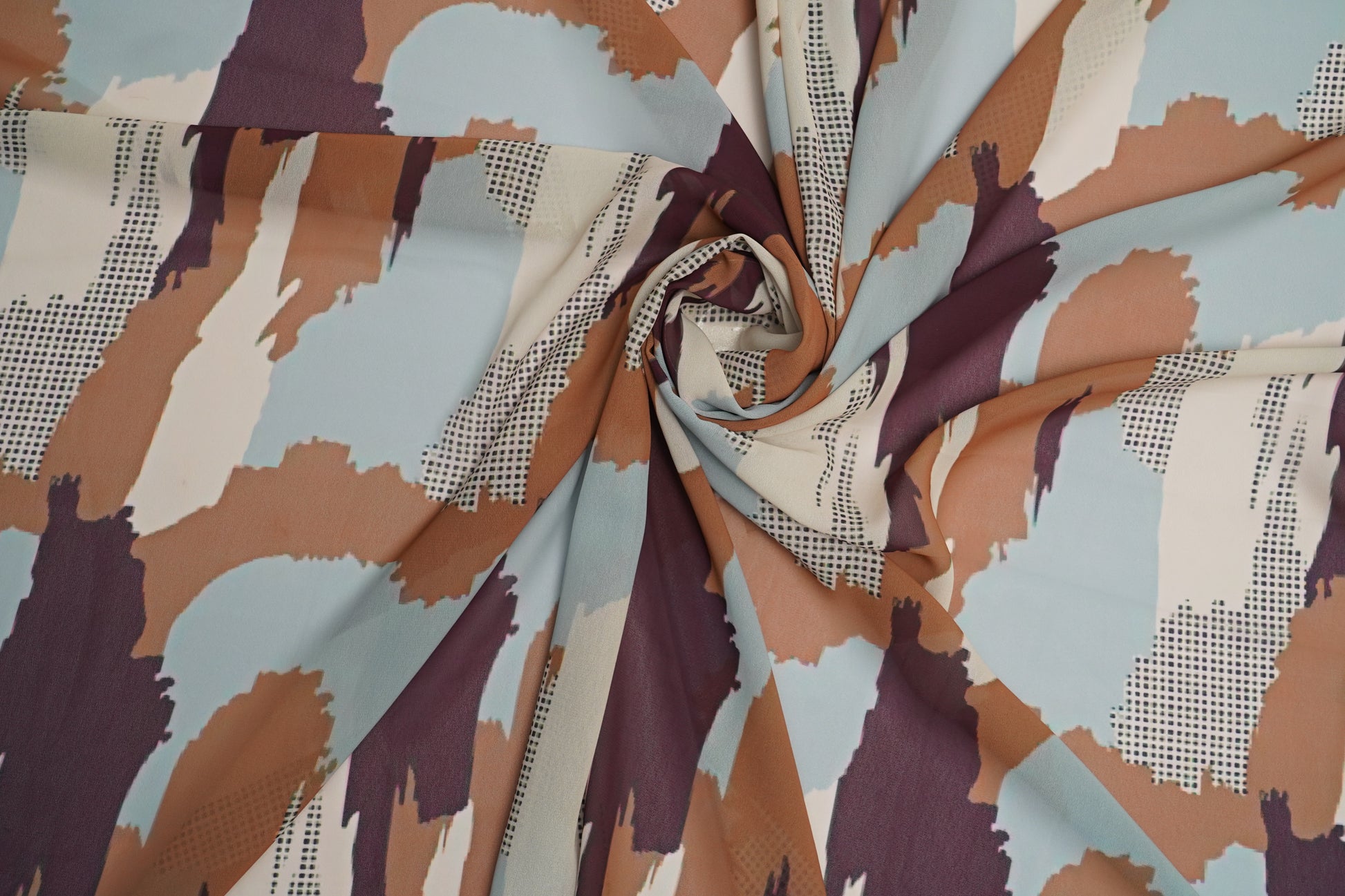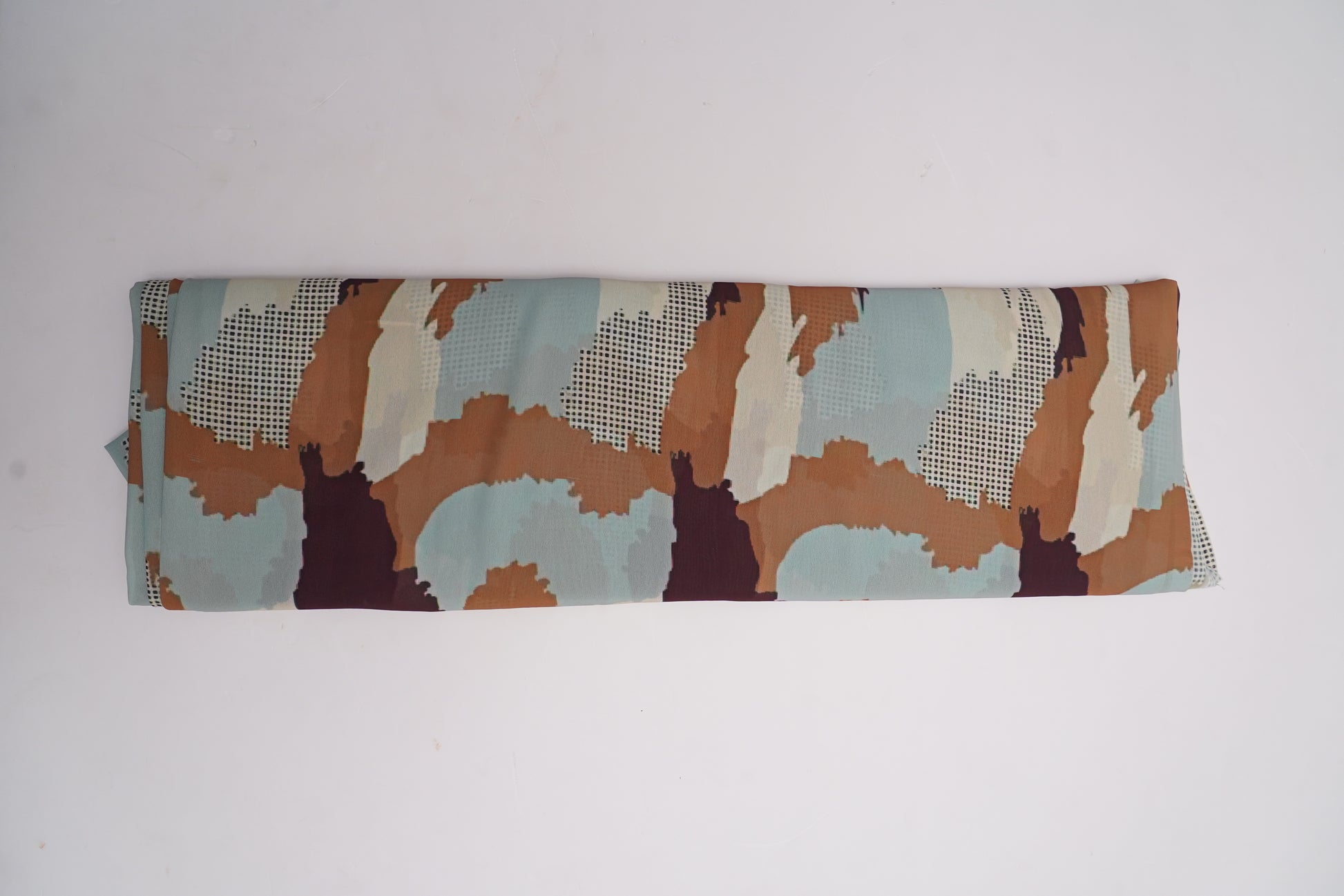 This digital georgette fabric showcases an abstract camo-inspired pattern in mint green, tan brown, maroon, and beige, highlighted with dotted texture details. Its fluid drape and bold modern look make it ideal for stylish statement outfits.