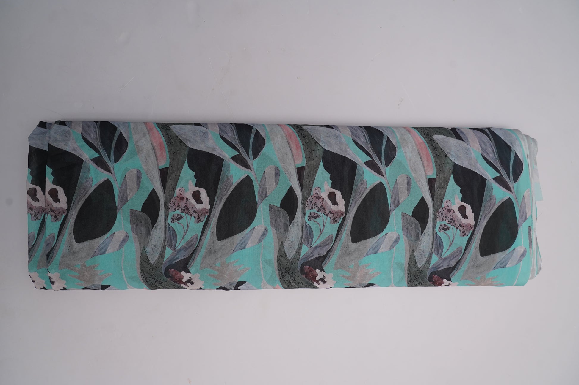 A dreamy digital georgette featuring a sea-green base with artistic teal, charcoal and soft grey leaves, highlighted by muted pink florals. Its fluid drape and watercolor texture create a modern yet elegant look, perfect for stylish outfits.