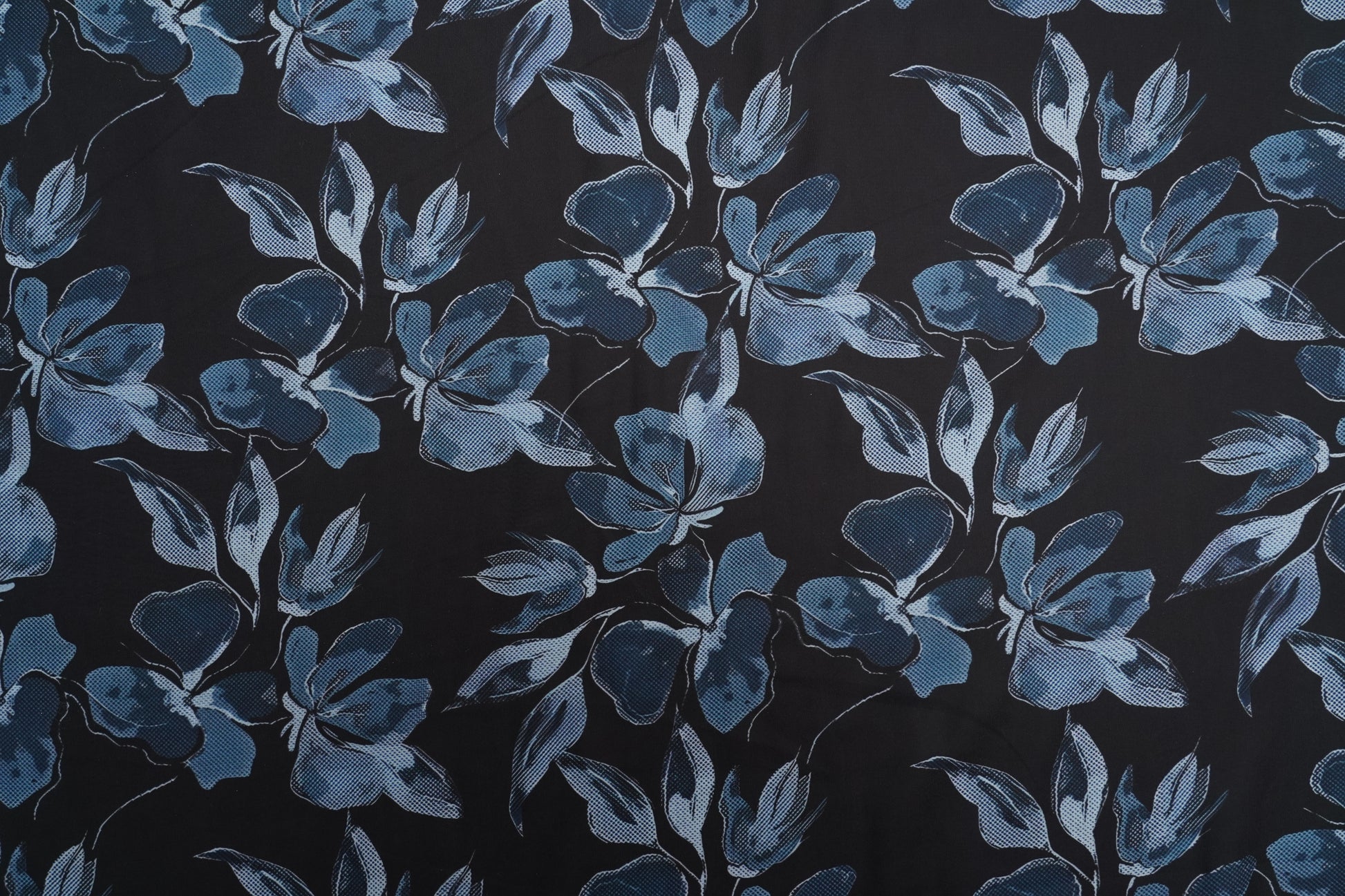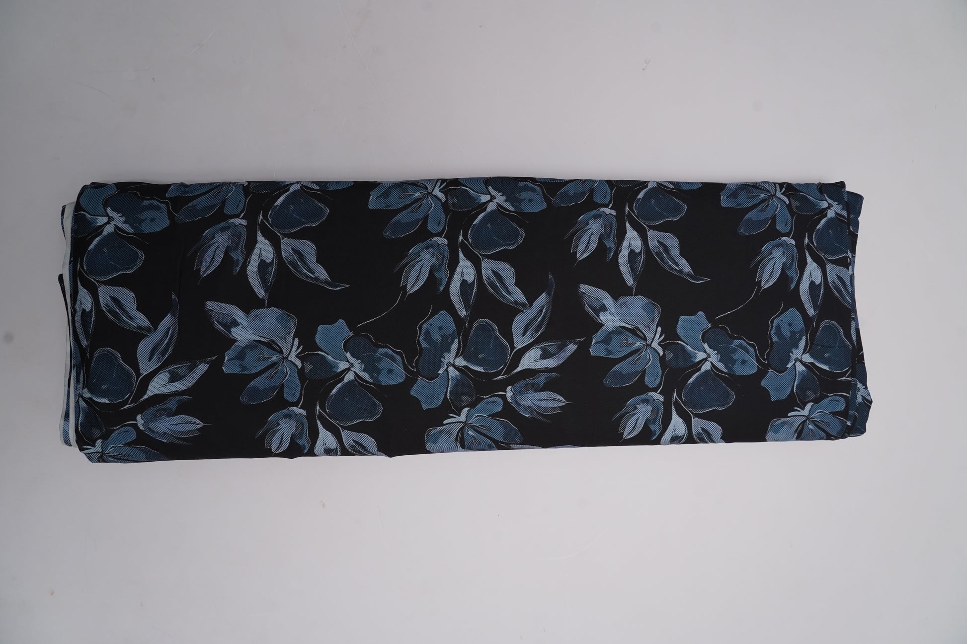 This Fiona digital fabric features a deep black base highlighted with denim-blue florals and soft leafy accents. The smooth drape, rich contrast, and modern artistic detailing make it perfect for elegant outfits with a bold, contemporary charm.