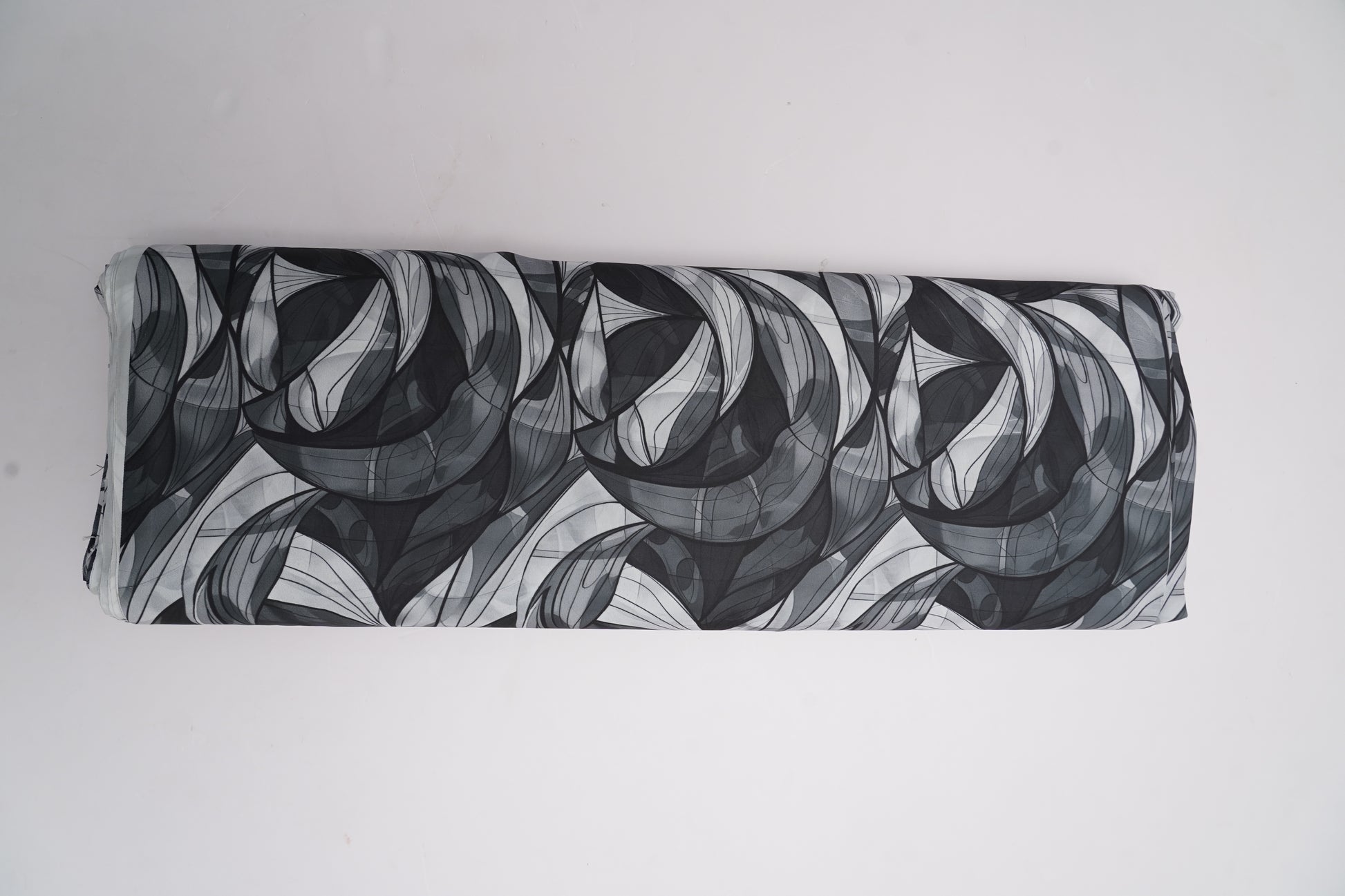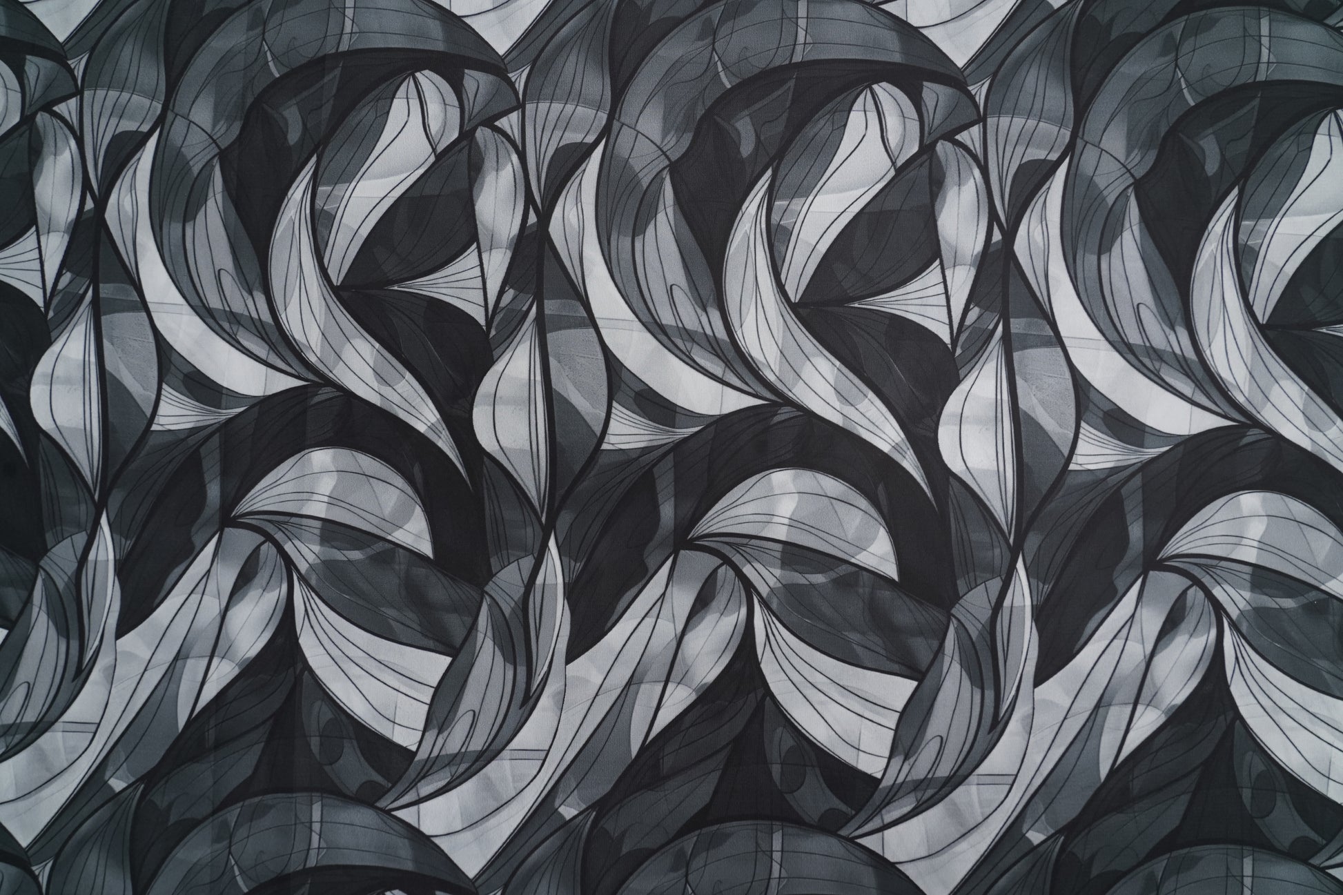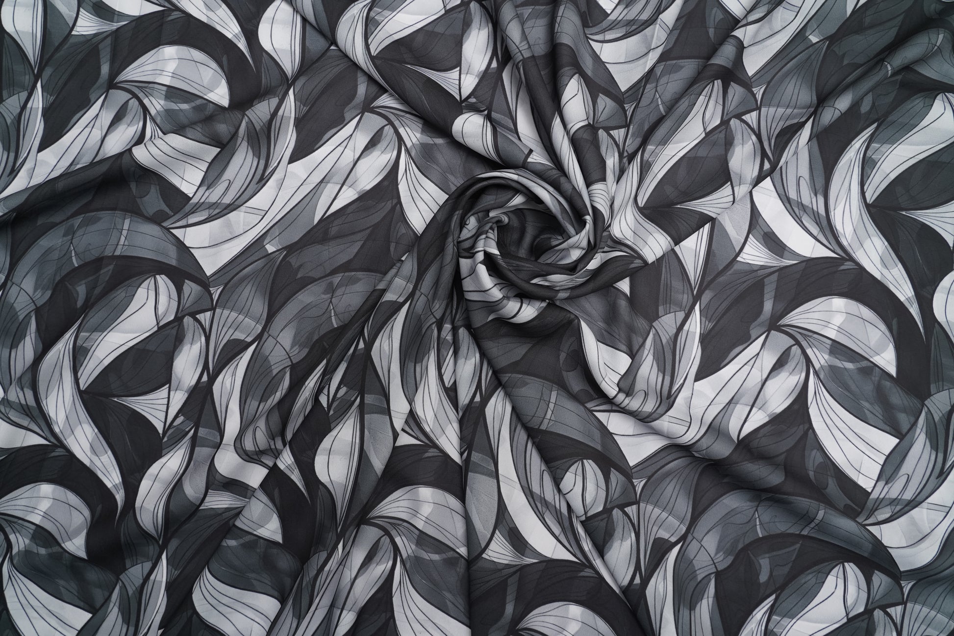 A modern Fiona digital fabric featuring layered abstract waves in black, dark teal green, and silver grey. The flowing curved pattern creates a smoky, dimensional effect, giving the fabric a bold, contemporary look perfect for chic outfits and statement wear.