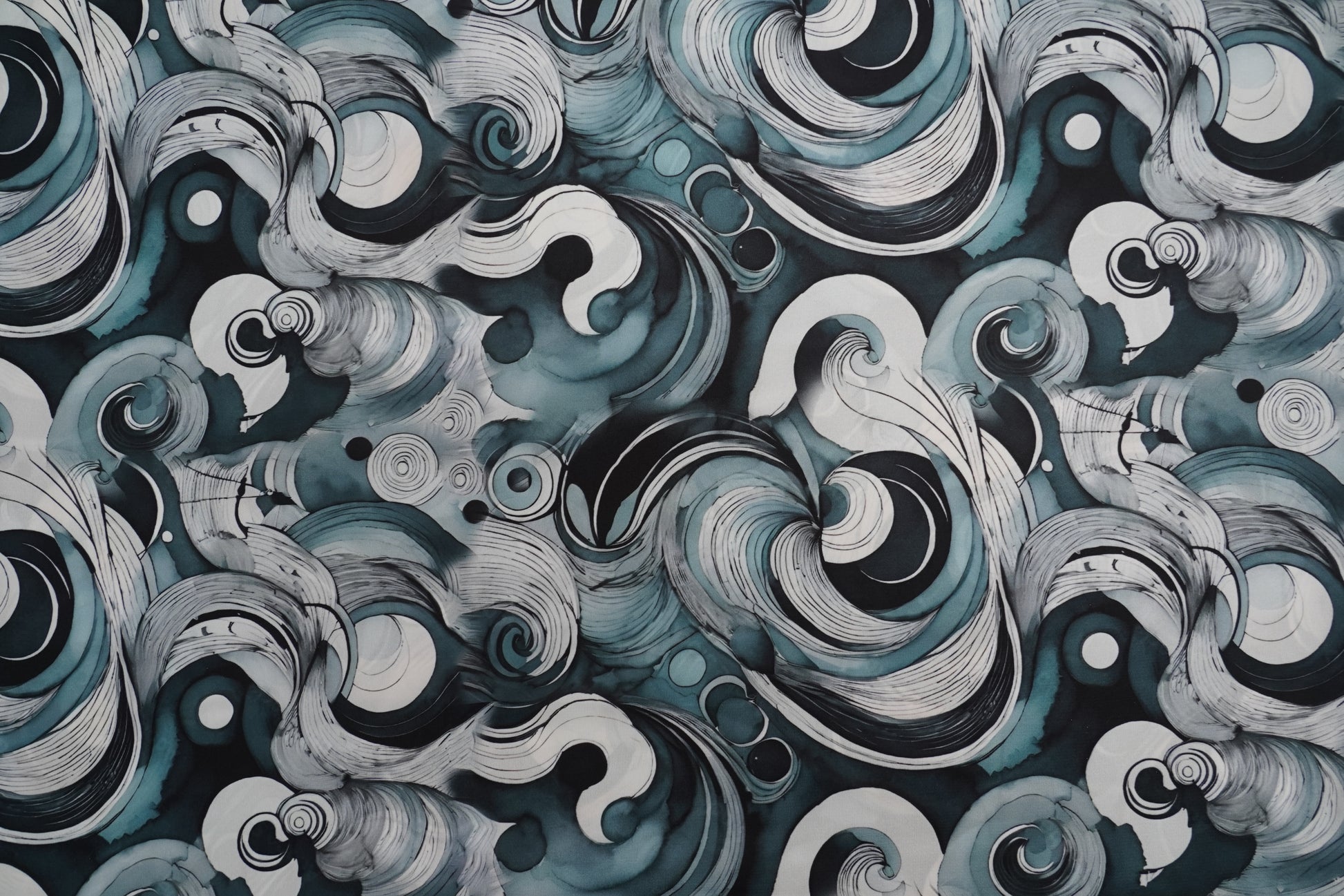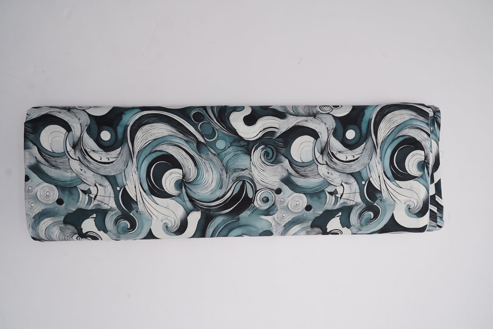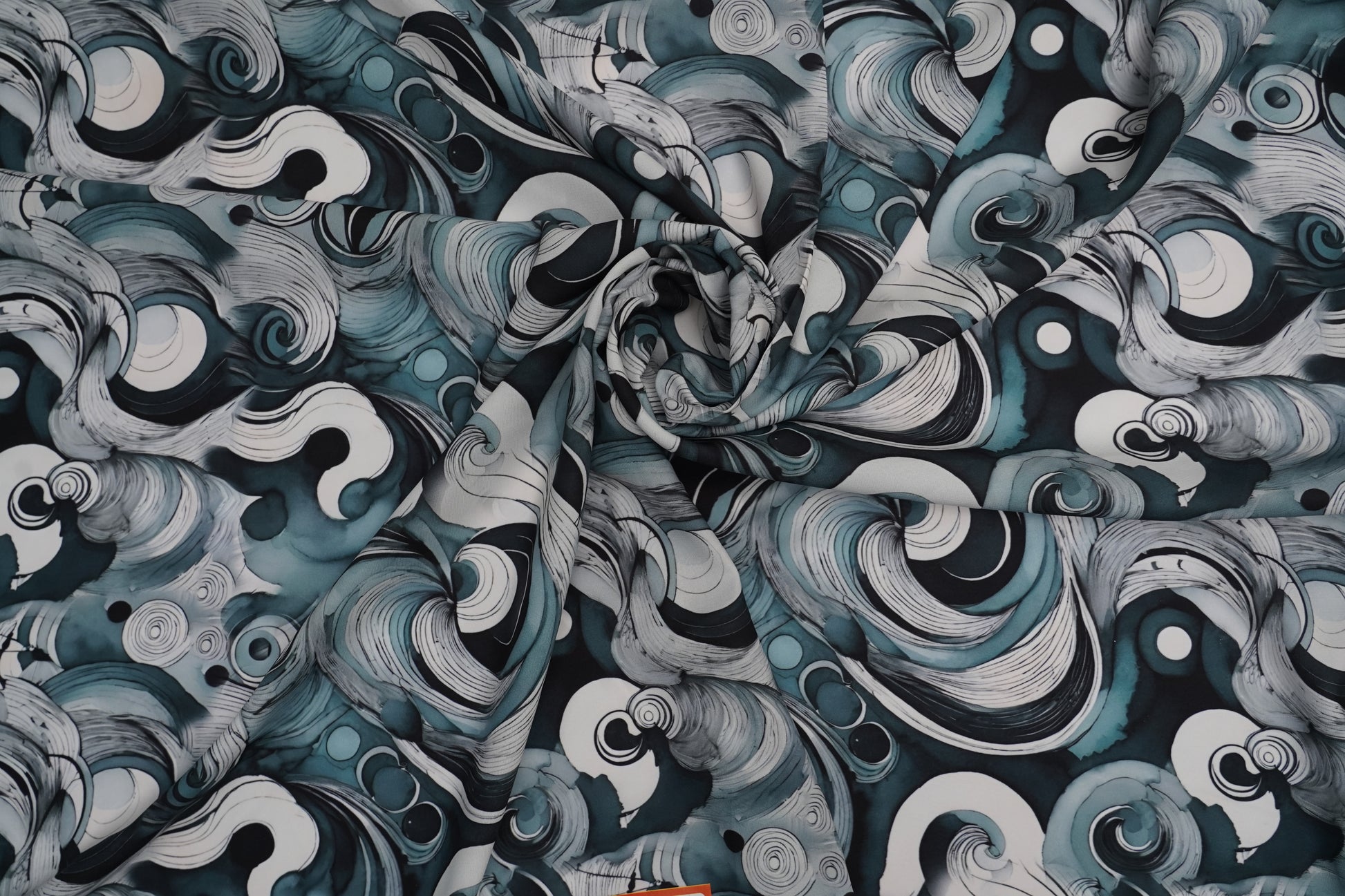 A striking Fiona digital fabric featuring artistic swirl patterns in dark teal green, charcoal black, soft grey, and icy white. The fluid abstract design adds a modern, high-fashion appeal, perfect for bold, contemporary outfits with a dynamic visual flow.