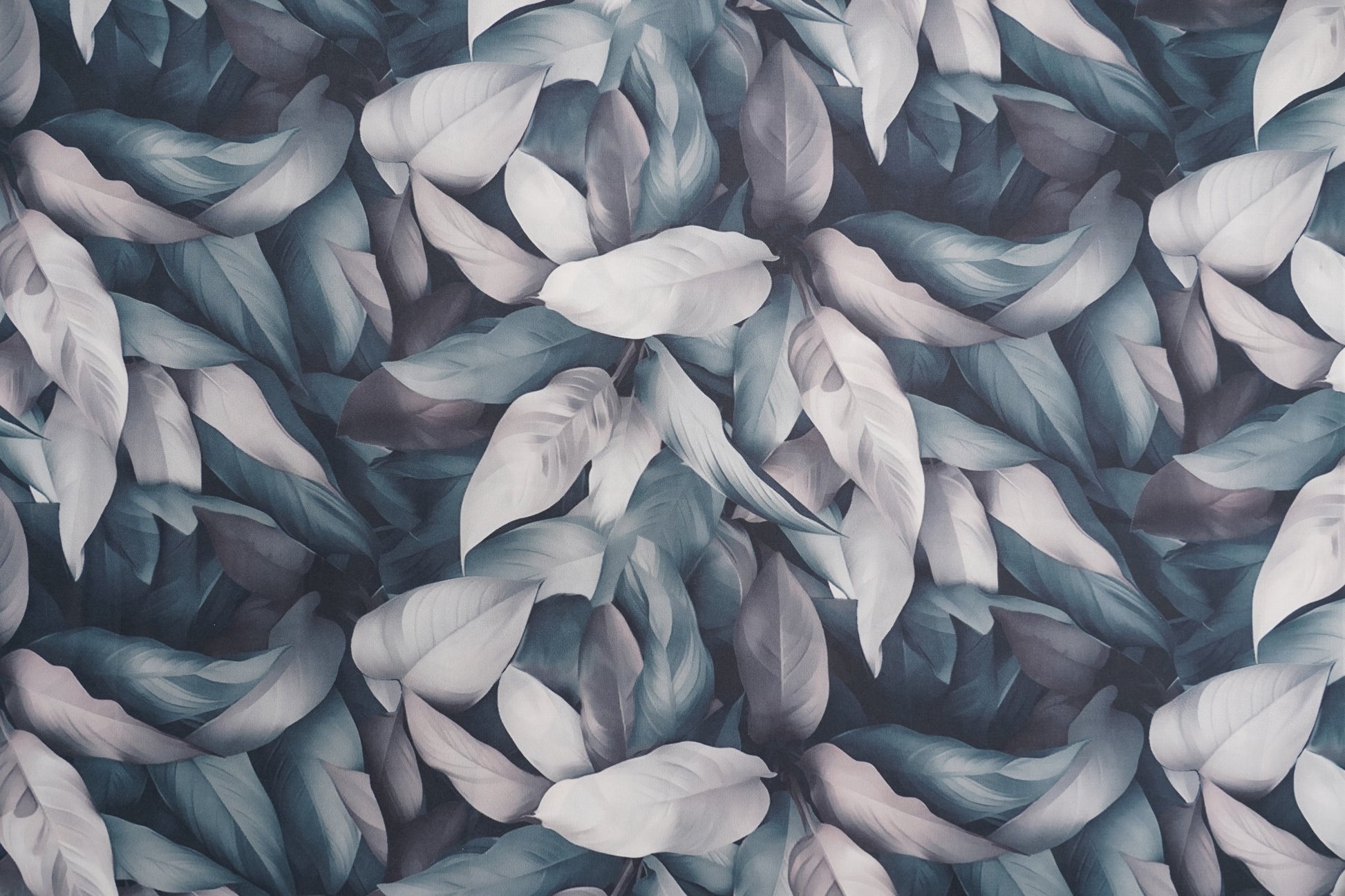 This Fiona digital print fabric features lush layered leaves in deep teal, grey, and smoky charcoal with soft white highlights. Its cool, misty palette creates a serene, nature-inspired look, perfect for elegant dresses, kaftans, and flowy contemporary outfits.