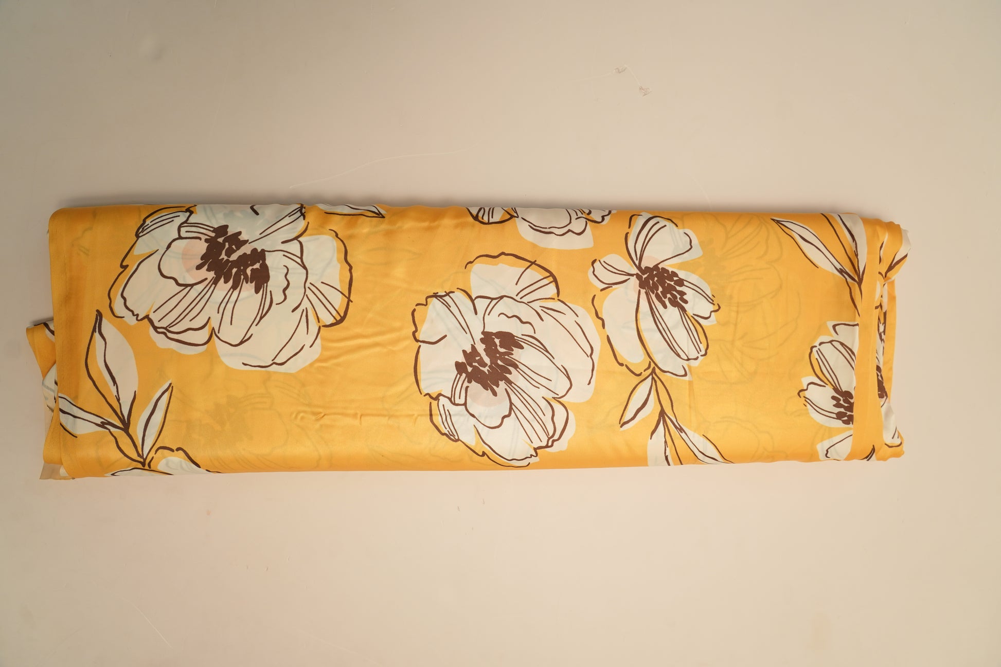 This heavy satin georgette fabric features bold off-white sketch-style florals over a bright yellow base. Brown outlines create contrast, while soft beige shading adds depth, giving the fabric a cheerful, modern, and summery appeal.