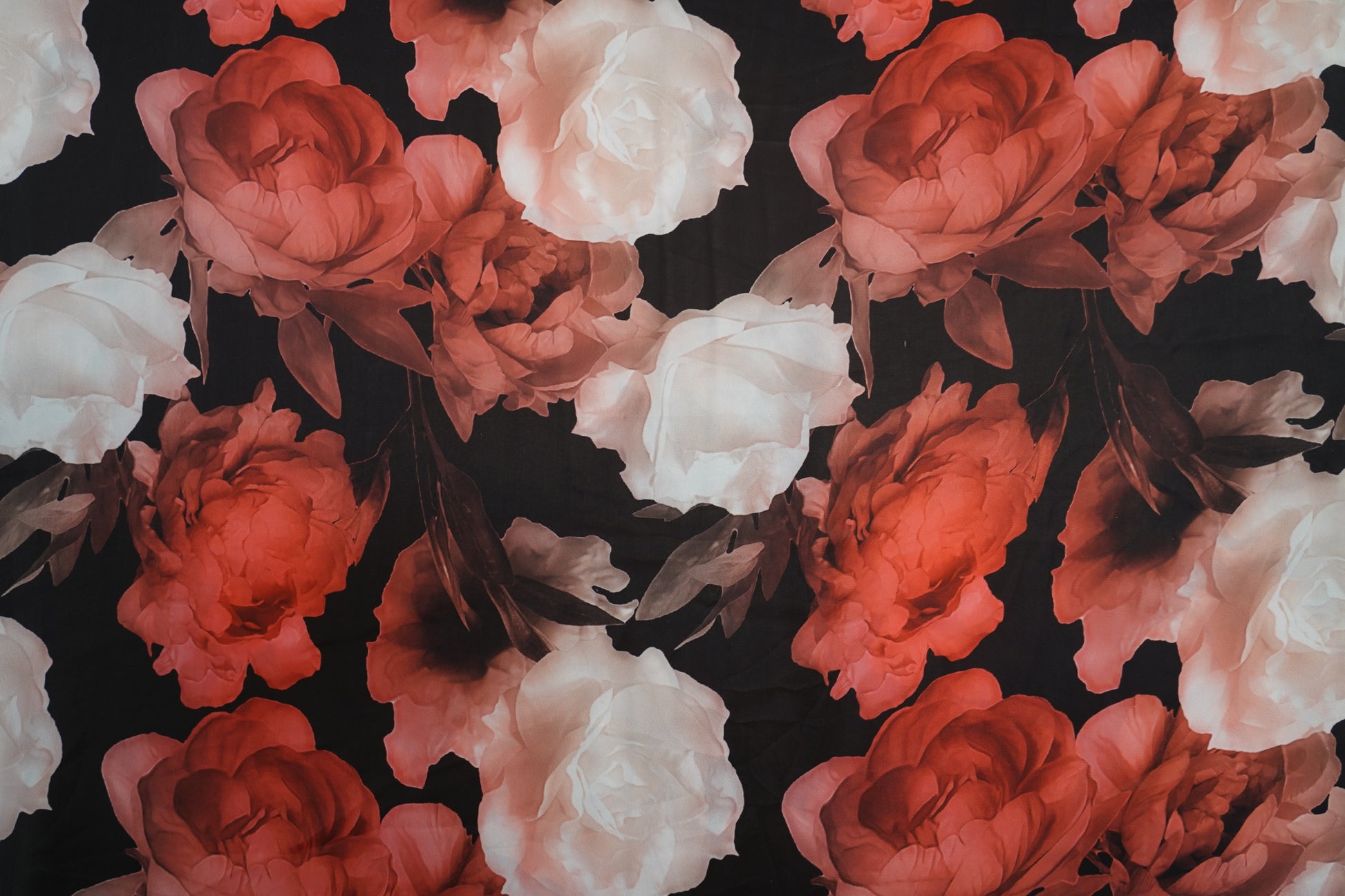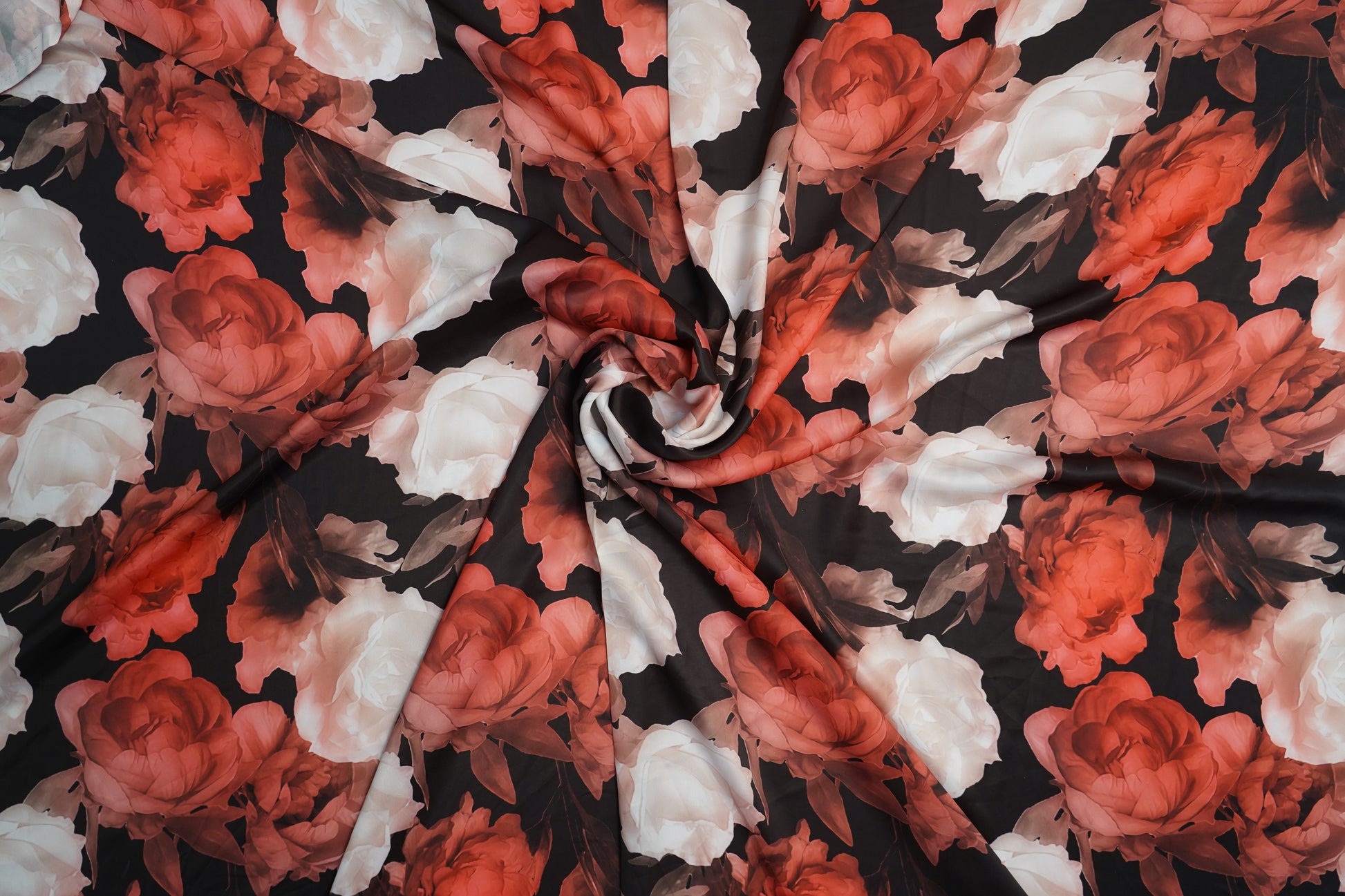 This heavy satin georgette fabric features bold red, coral, and ivory roses blooming over a rich black base. Soft brown shading adds depth, giving the fabric a dramatic, luxurious, and elegant appeal perfect for statement-worthy outfits.