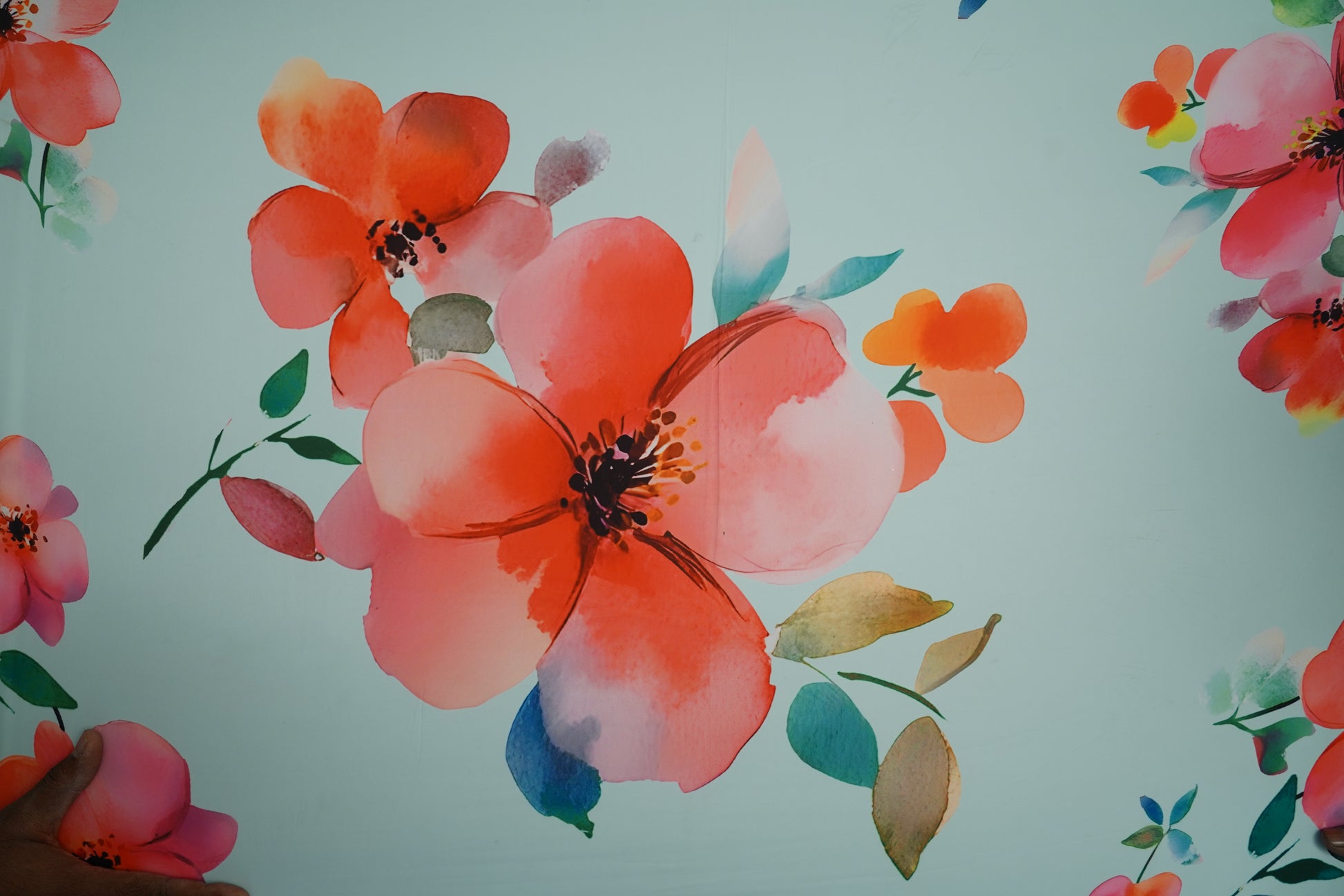 This heavy satin georgette fabric features dreamy watercolor florals in coral, peach, and pink over a soothing mint aqua base. Teal and emerald leaves add freshness, giving the fabric a bright, flowy, and artistic look perfect for summer outfits.