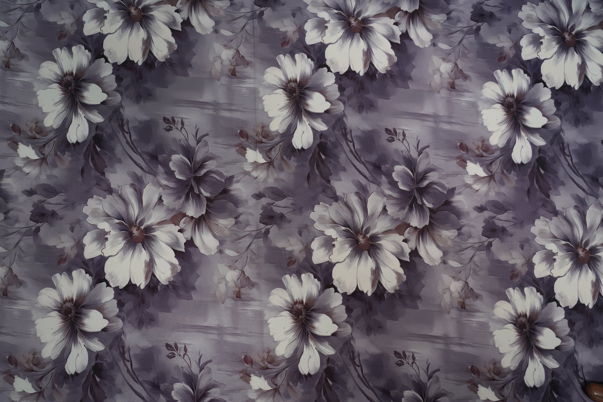 This heavy satin georgette fabric features soft ivory flowers blooming over a smoky lavender base. Charcoal shadows and dusty mauve accents add depth, giving the fabric a dreamy, vintage, and elegantly flowing appeal perfect for refined outfits.
