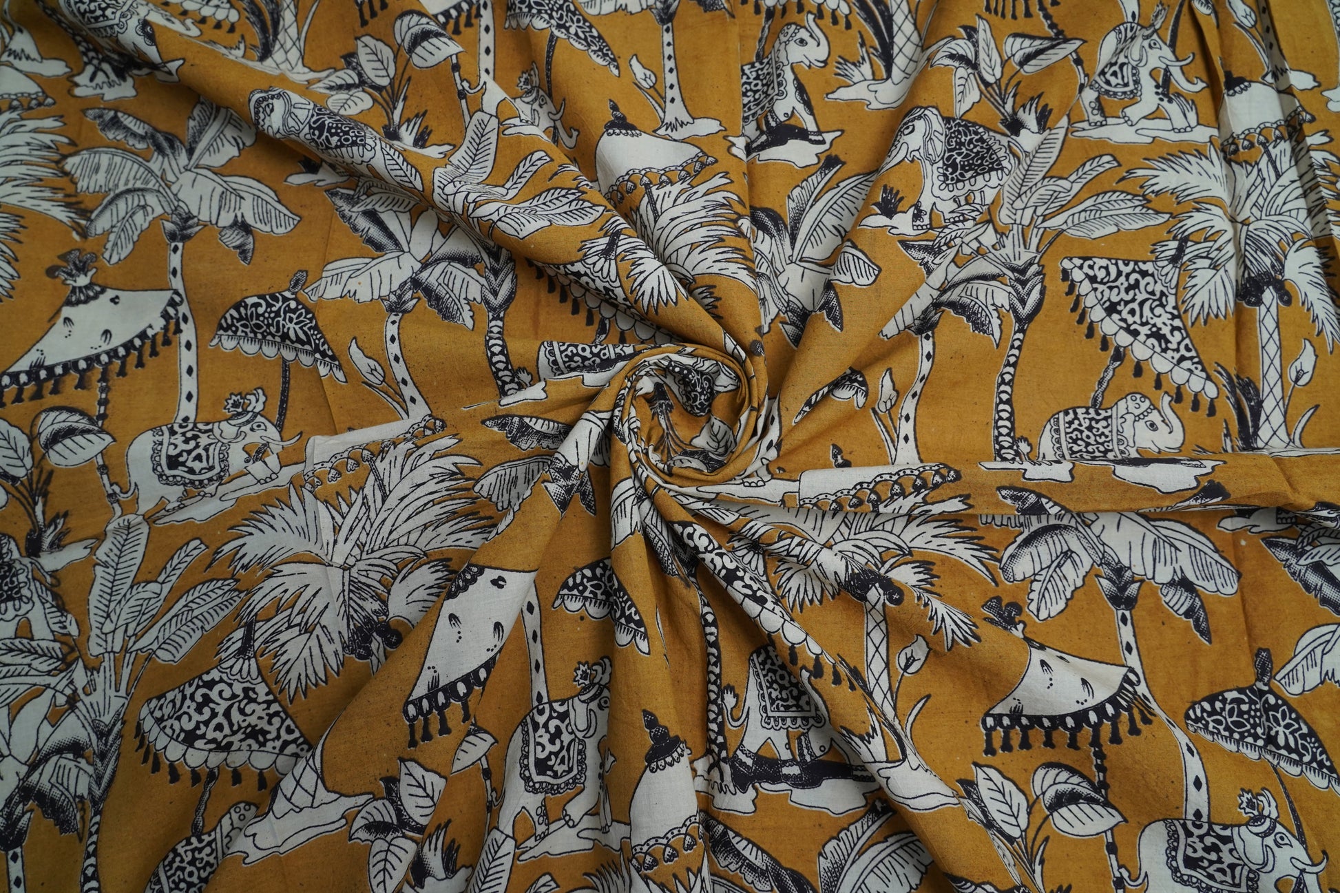 A traditional Kalamkari cotton showcasing a mustard-ochre base with ivory elephants, palm trees, and ornate umbrellas. Black detailing enhances the hand-drawn charm, creating a rich, storytelling textile full of cultural character and artistry.
