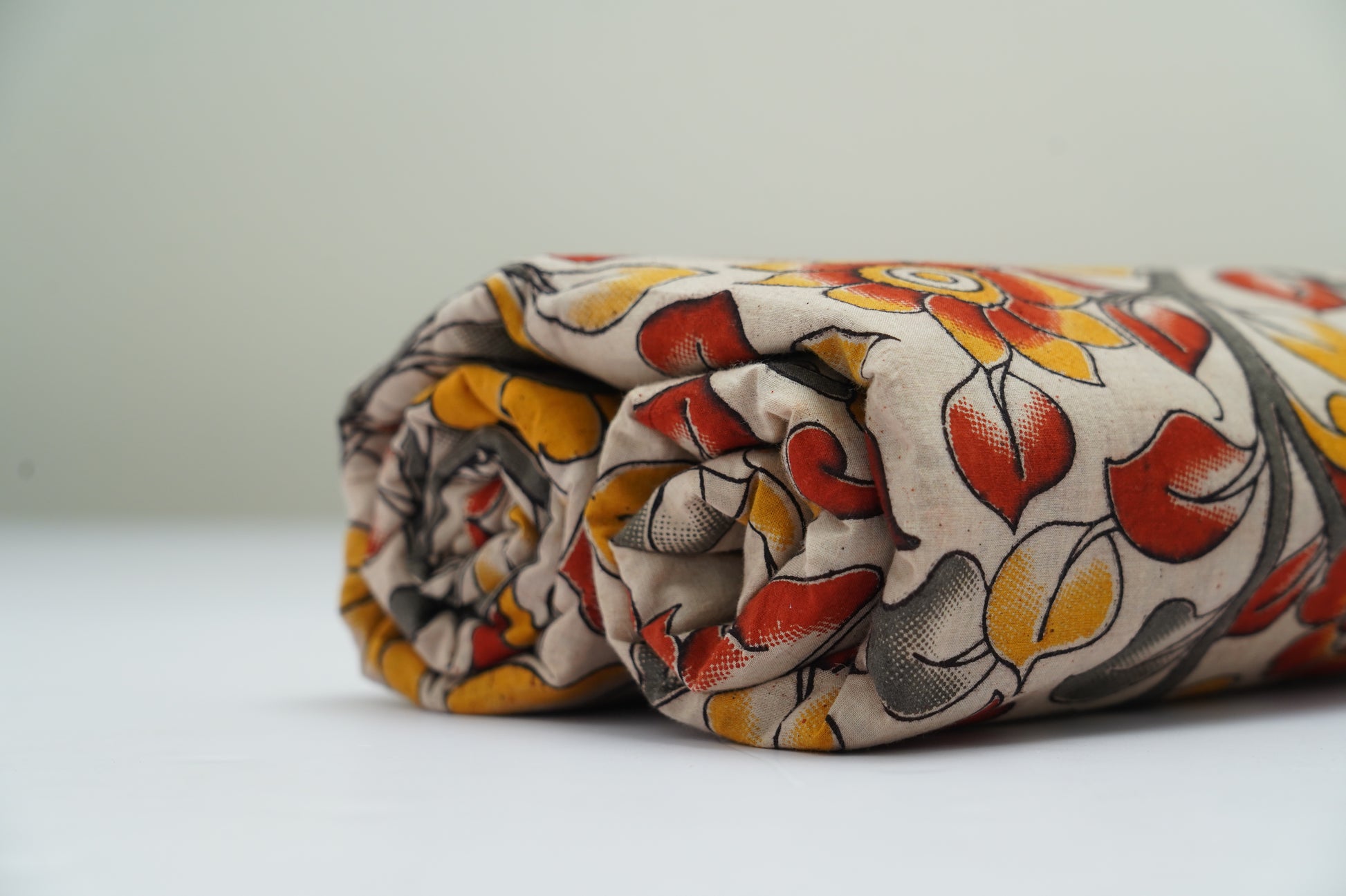 A vibrant Kalamkari cotton featuring an off-white backdrop filled with brick-red blooms, mustard petals, and shaded grey leaves. Flowing vines and bold hand-drawn detailing create a lively, traditional, and richly artistic look.