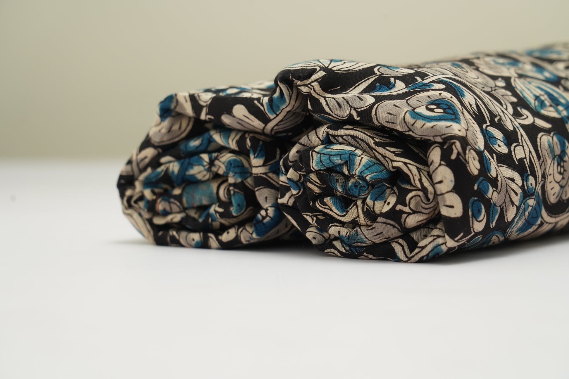 A classic Kalamkari silk featuring bold ivory florals on a rich black backdrop, highlighted with deep teal accents and fine grey detailing. The hand-drawn vines and petals create an elegant, artisanal texture with timeless appeal.