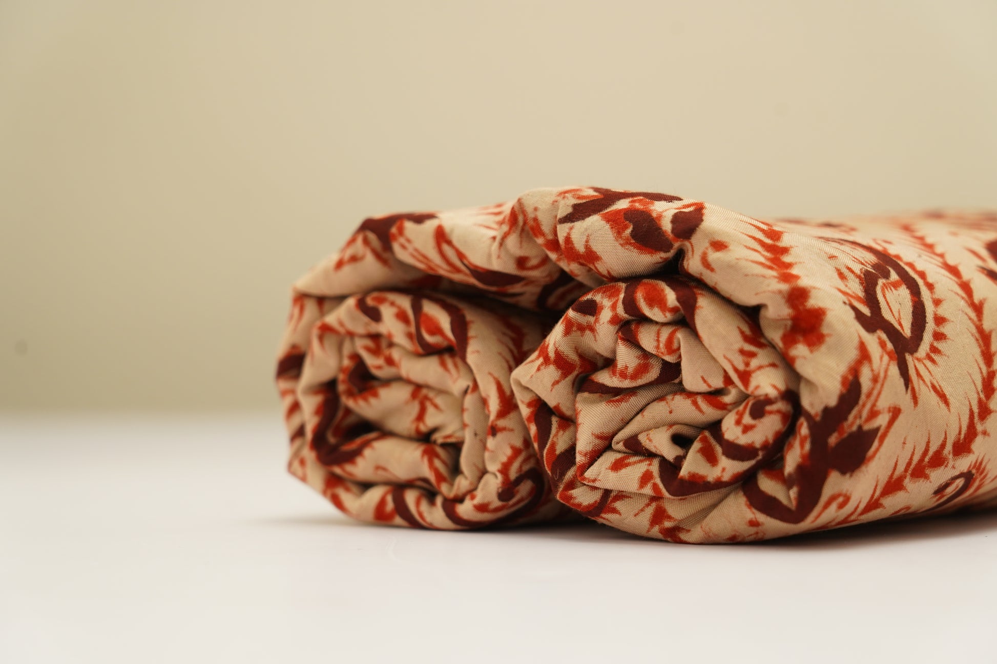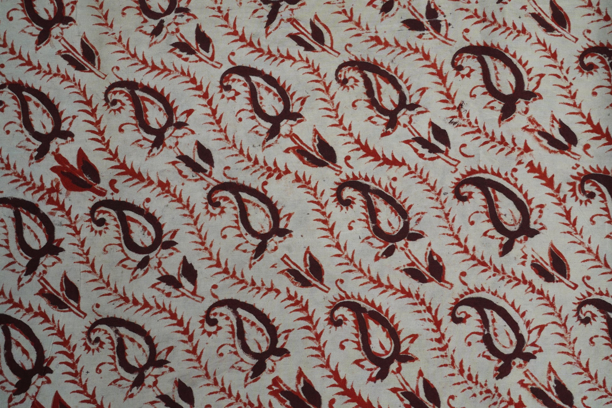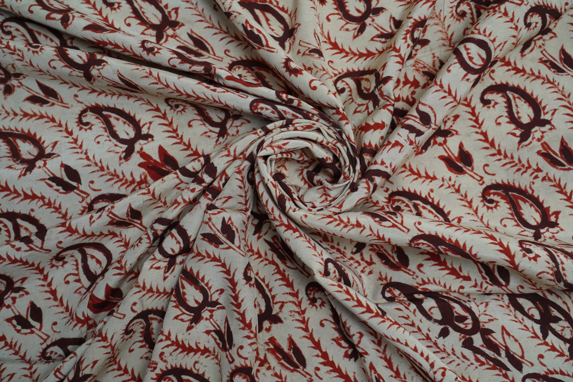 A traditional Kalamkari silk featuring a soft beige backdrop adorned with rust-red paisleys and terracotta florals. Hand-drawn vines and maroon accents add depth, giving the fabric a rustic, earthy, and culturally rich artisanal appeal.