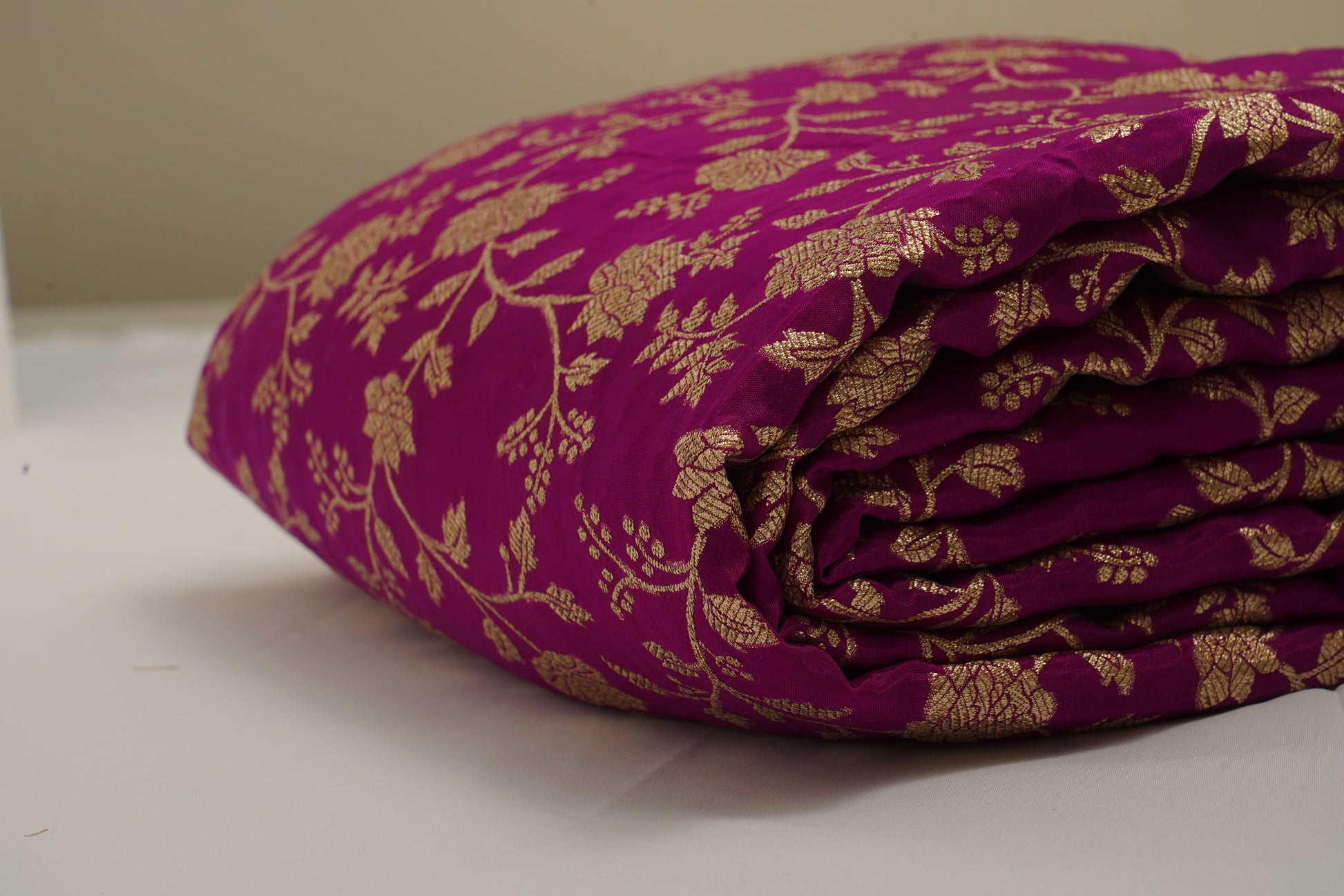 “Bursting with vibrant charm, this Magenta Pink Jaal Banarasi fabric features intricate woven motifs and a rich, luminous texture. Bold yet elegant, it adds a statement-making blend of tradition and sparkle to any ethnic creation.”
