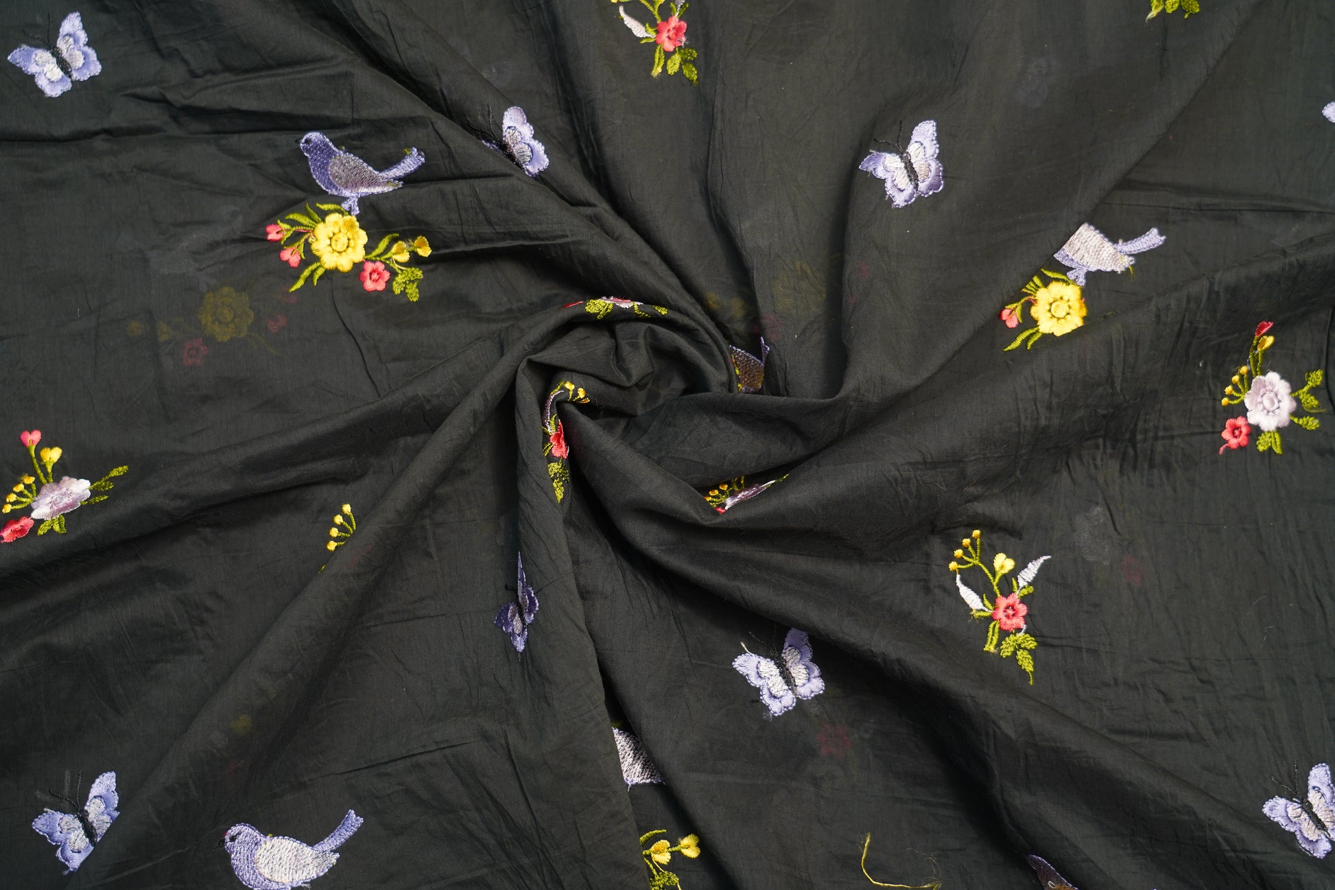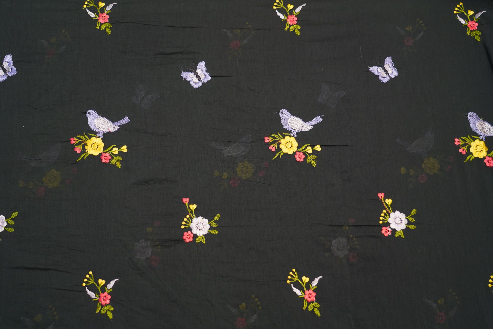 Soft black mul cotton with embroidered birds, butterflies, and floral motifs. Lightweight, breathable, and perfect for elegant kurtis, dresses, dupattas, and festive wear. The dark base enhances the colorful threadwork for a stylish, nature-inspired look.