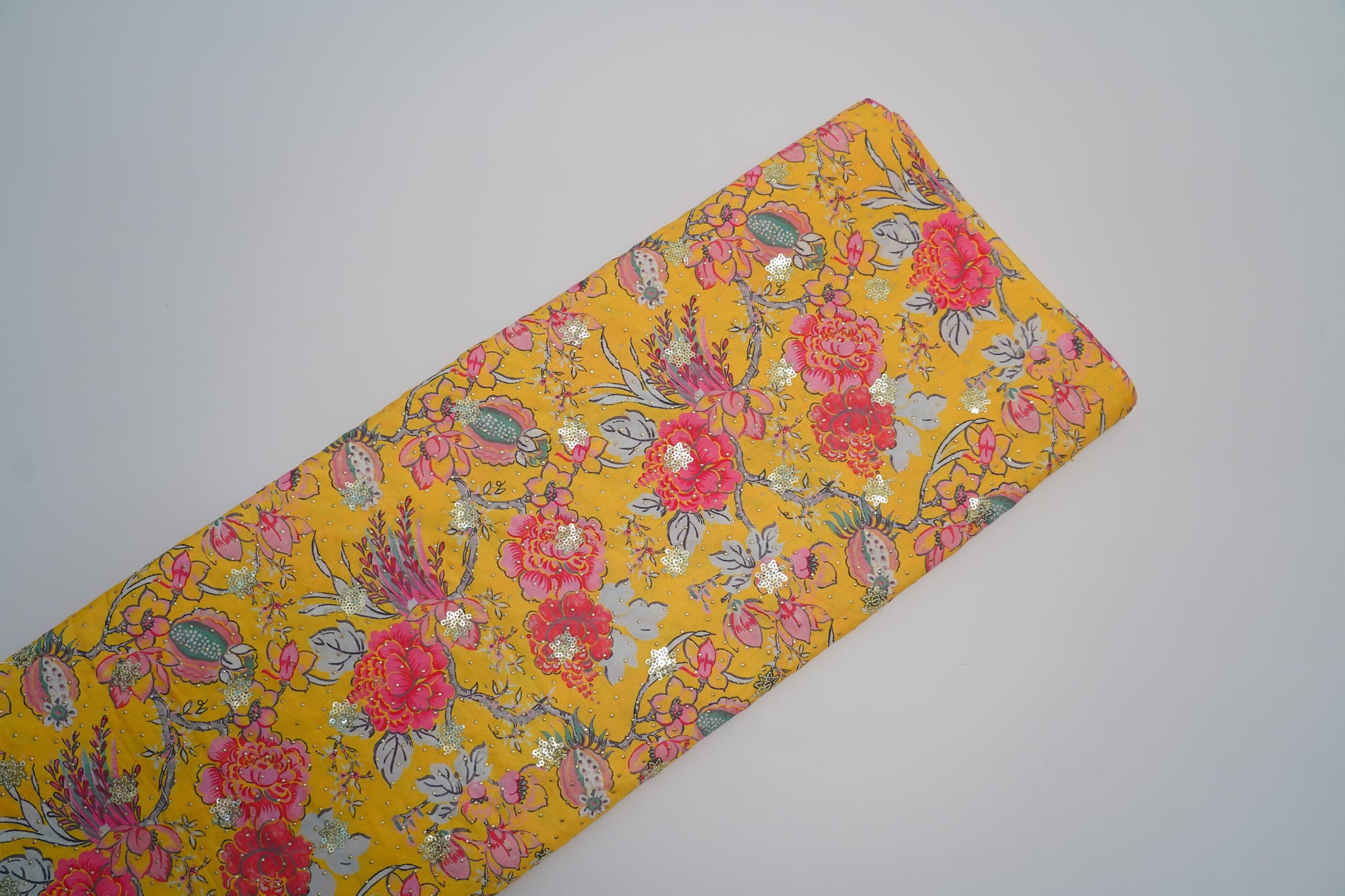 Vibrant yellow fabric featuring bold pink and grey digital floral prints with shimmering accents. Soft, stylish, and perfect for festive outfits, kurtis, dresses, and dupattas. A bright blend of elegance and contemporary floral charm.