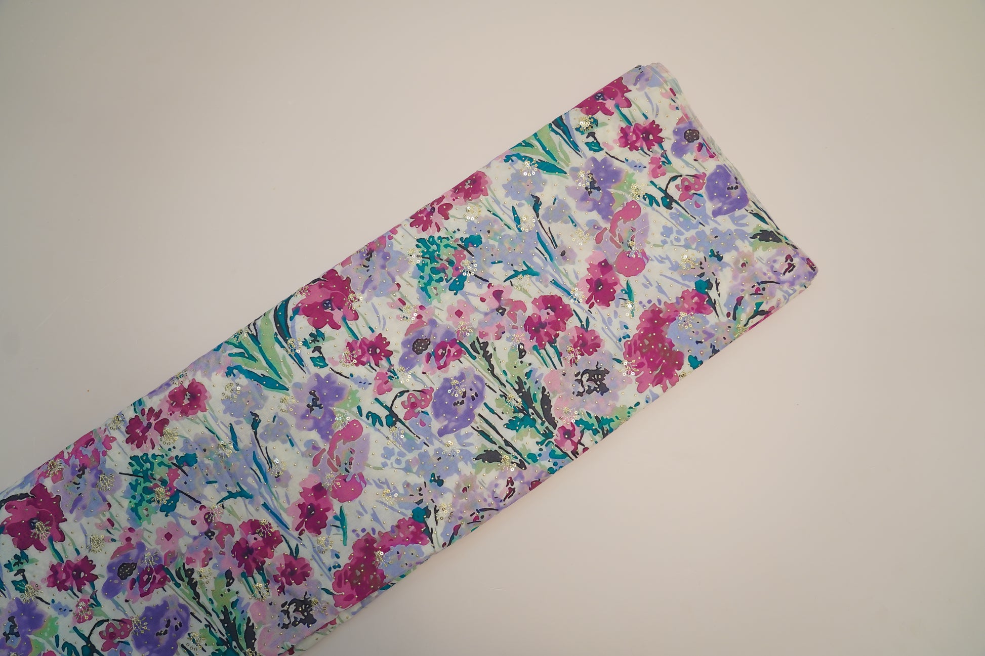 Elegant pastel floral fabric on a soft white base, highlighted with pink and purple blooms and subtle glitter accents. Perfect for dresses, kurtis, sarees, and festive wear. Lightweight, vibrant, and ideal for modern summer fashion.