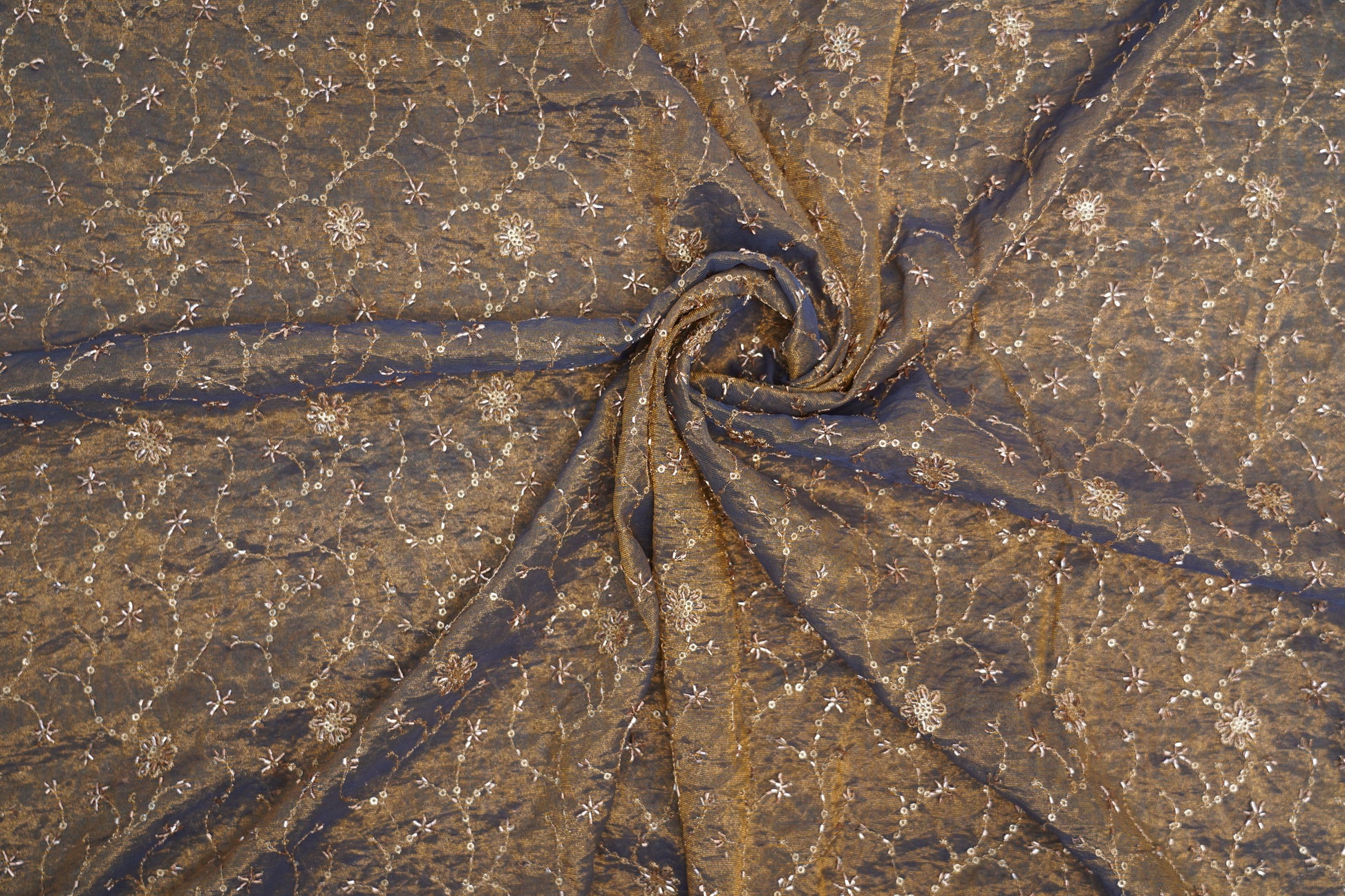 Luxurious rustic blue gold fabric featuring delicate floral vine embroidery with shimmering sequins. Its rich texture and subtle metallic sheen make it perfect for couture outfits, lehengas, gowns, sarees, and high-end festive wear. Elegant, refined, and timeless.
