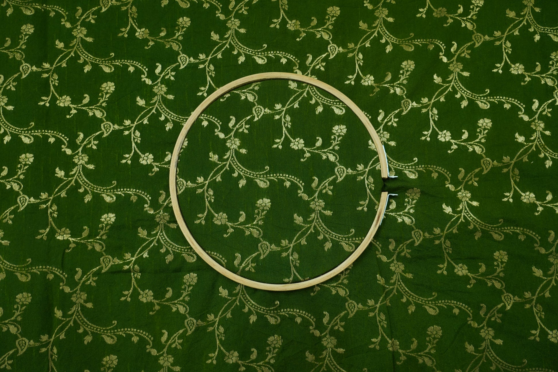 “Inspired by the richness of nature, this lush green Banarasi fabric blooms with intricate gold vines. Fresh, vibrant, and perfect for graceful traditional ensembles.”