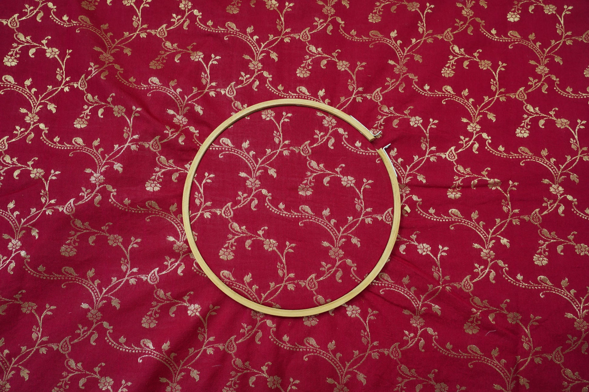 “Wrapped in a deep maroon hue, this brocade fabric carries an aura of royal mystery. Its golden jaal detailing adds a luxurious, regal charm to every creation.”