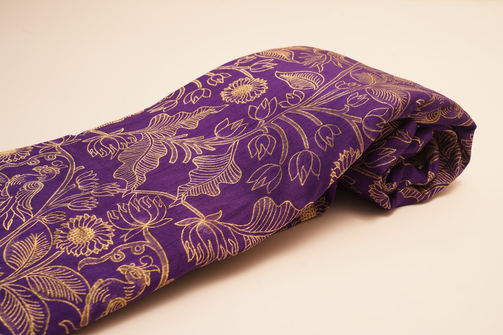 A luxurious royal-purple brocade enriched with golden leaf motifs. Exudes heritage charm and sophistication for premium ethnic ensembles.