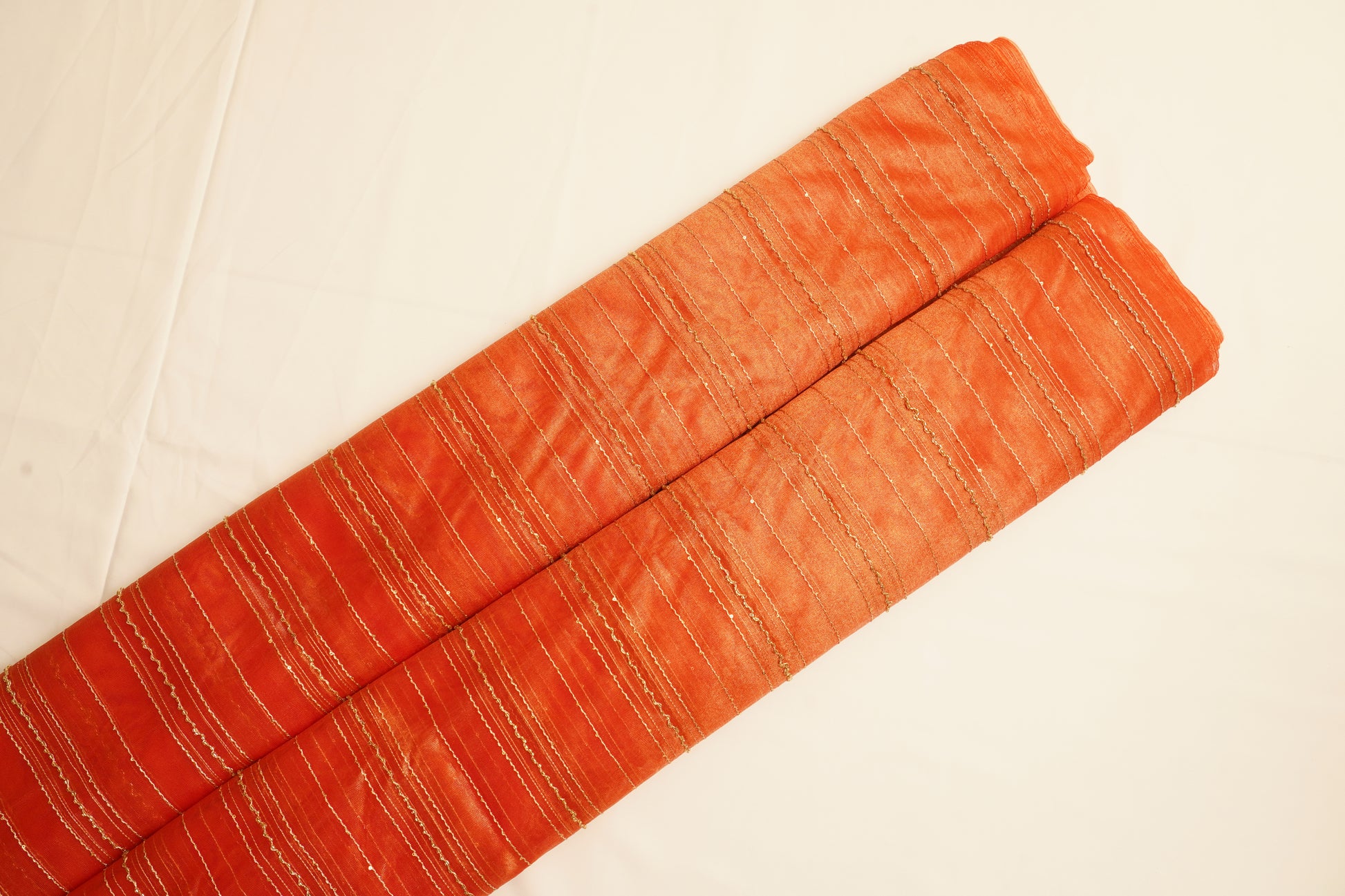 “Bold, bright, and celebratory—this rust orange tissue crush sequence fabric lights up with shimmering golden sequence work. Ideal for lively festive outfits that stand out instantly.”