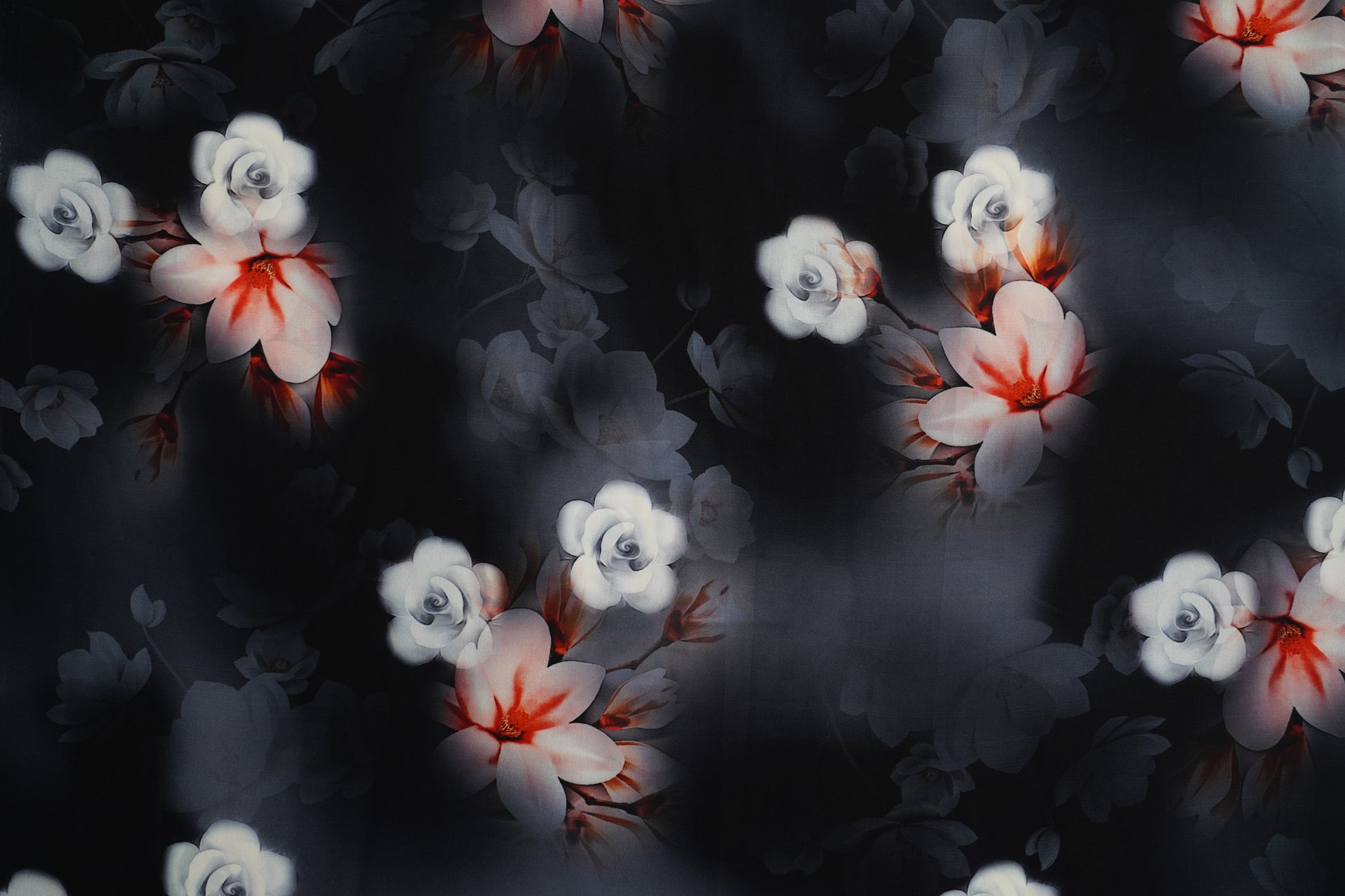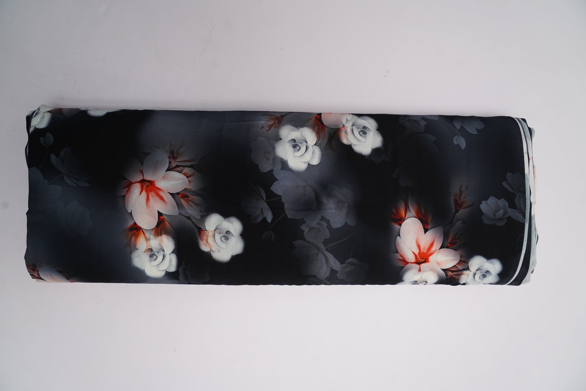 This soft silk touch fabric features a deep black base enhanced with smooth charcoal gradients and delicate white-ivory flowers. Subtle coral-orange highlights add warmth, giving the print an elegant, dreamy, and luxurious flow.