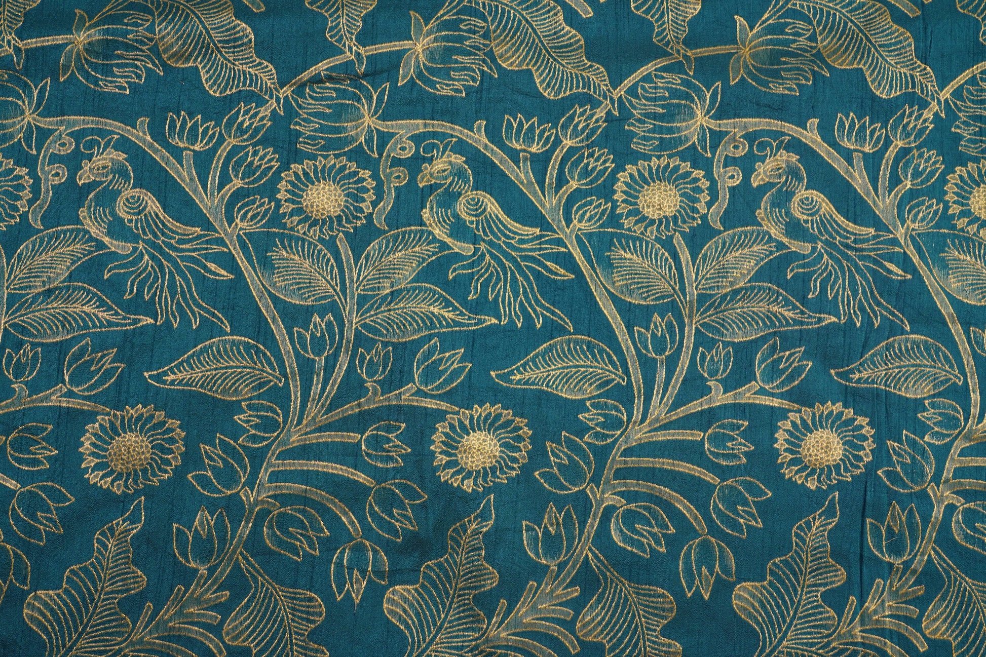 Cool and refreshing, this teal-blue brocade stands out with its striking contrast of golden threadwork—perfect for chic ethnic wear.