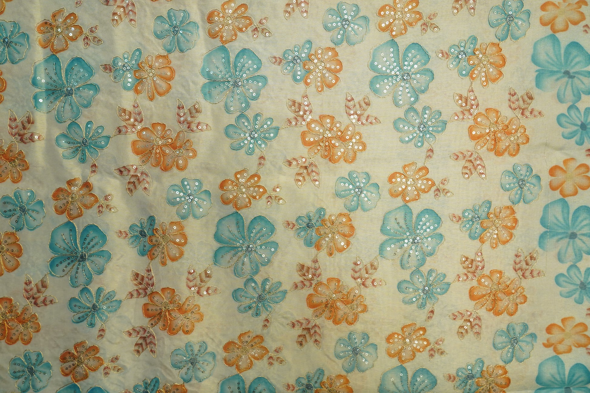 This tissue gold fabric features unique position embroidery in aqua blue and golden yellow. The striking contrast of cool blue and warm gold motifs adds a refreshing, elegant touch, perfect for standout festive fashion.