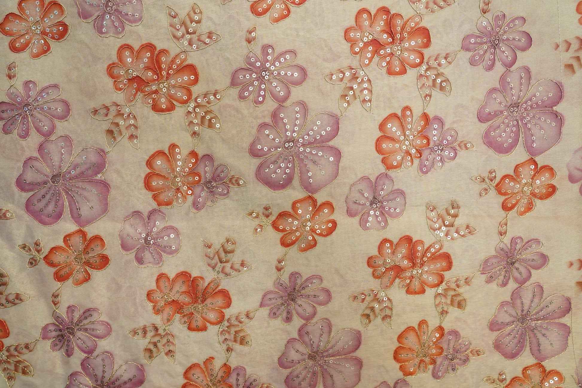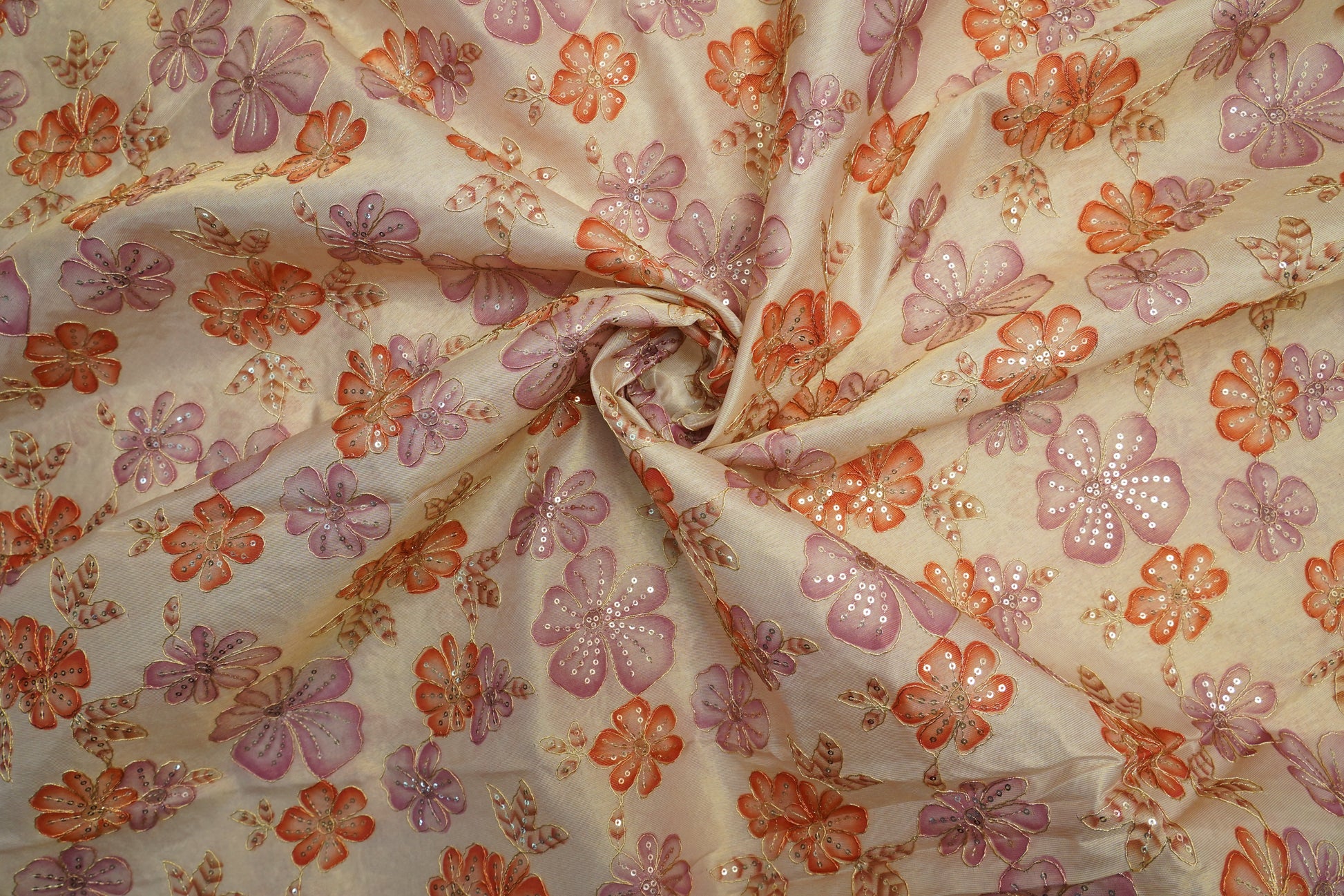This tissue gold fabric is beautifully embellished with position embroidery in vibrant orange and onion pink tones. The blend of radiant hues and shimmering texture makes it ideal for festive, statement-making ensembles.