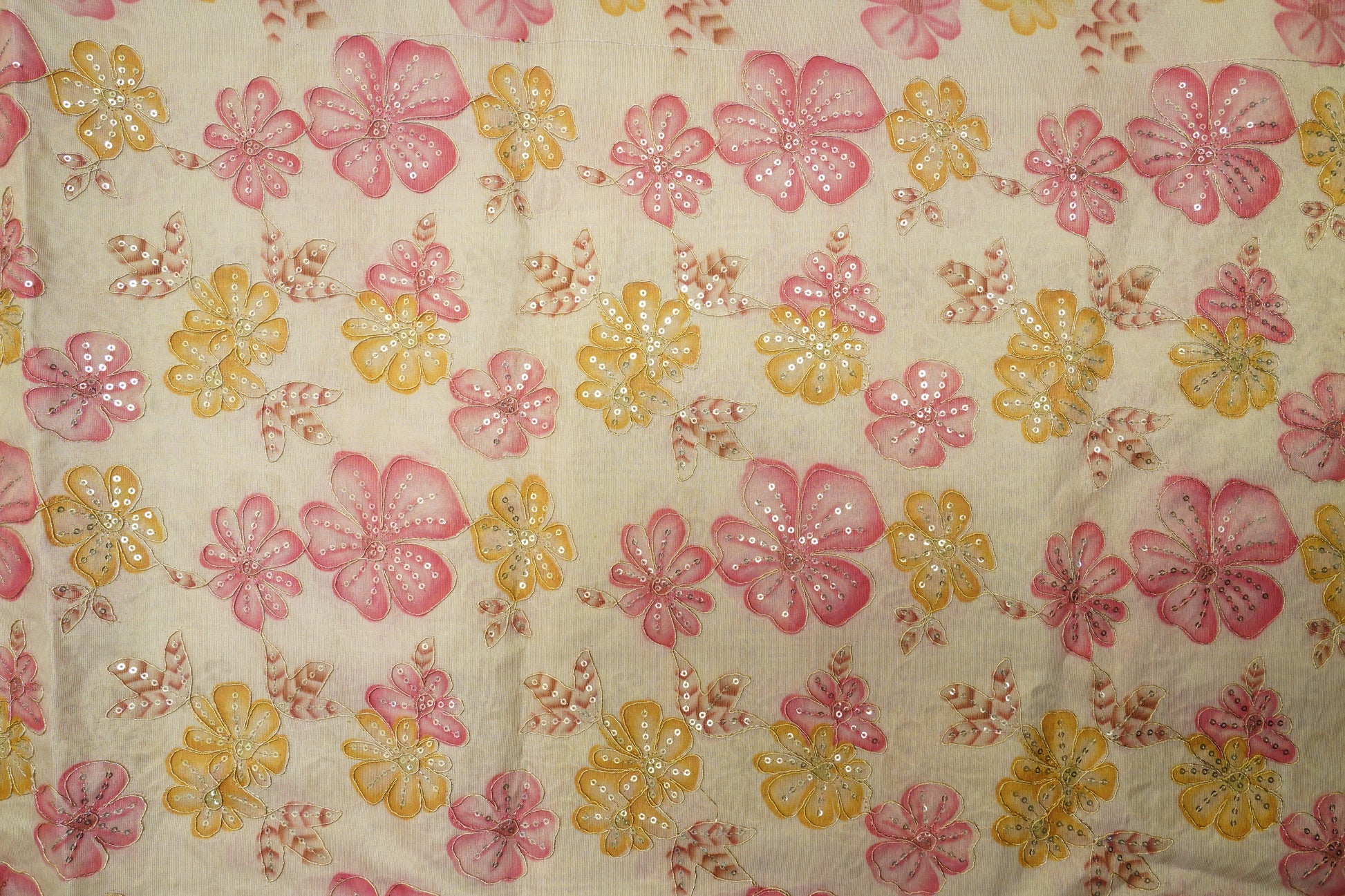 This stunning tissue gold fabric is adorned with intricate pink position embroidery, offering a radiant, festive look. The luxurious shimmer and delicate detailing make it perfect for wedding and celebration outfits