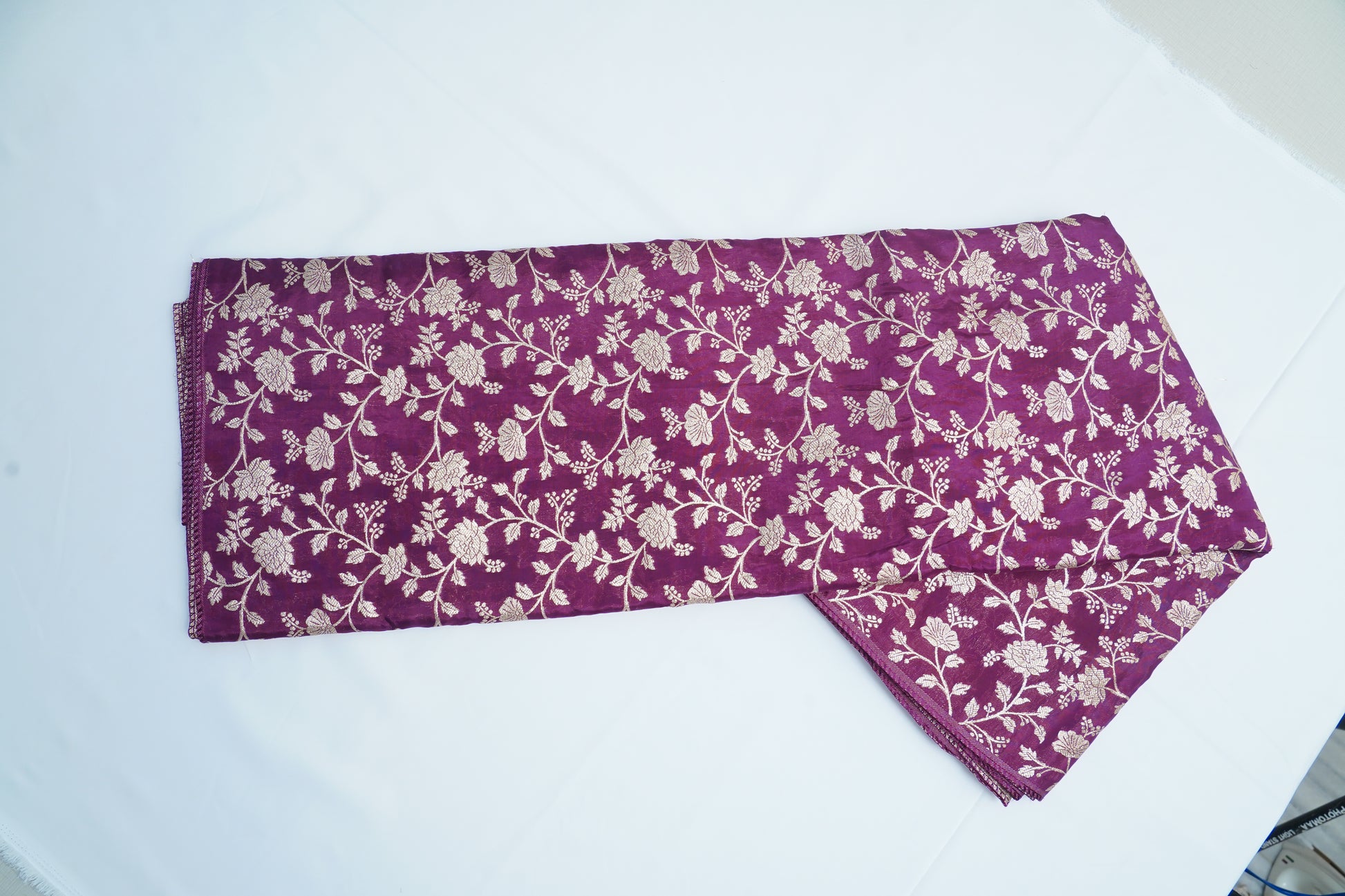 “Bathed in a rich wine hue, this Jaal Banarasi fabric pairs intricate heritage weaving with a soft, royal sheen. Its deep, luxurious tone and detailed pattern make every creation feel elegant, refined, and effortlessly timeless.”