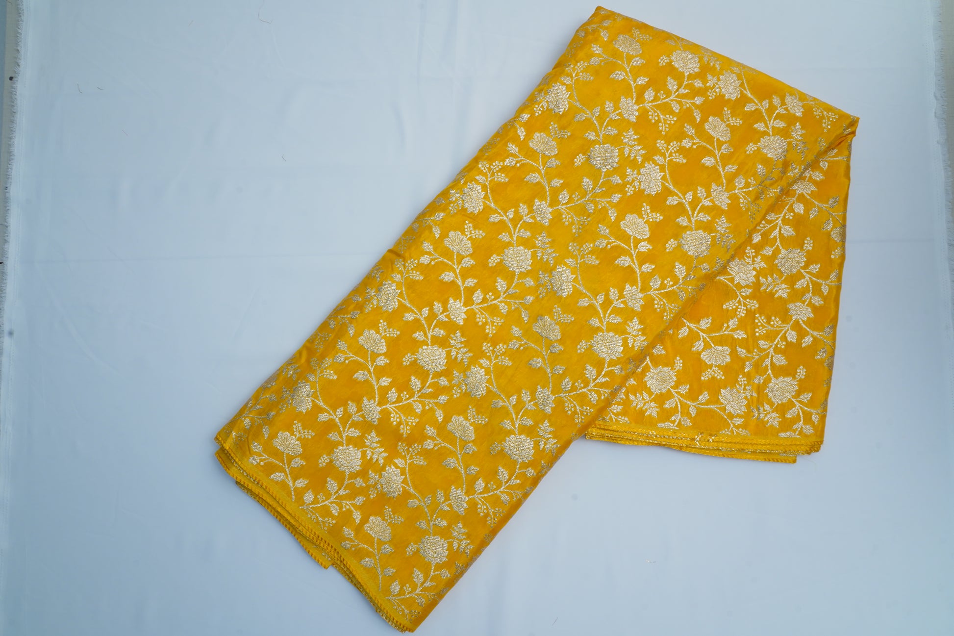 A radiant yellow Banarasi fabric adorned with an intricate all-over jaal pattern, woven with traditional craftsmanship. Rich, elegant, and perfect for festive and bridal outfits.